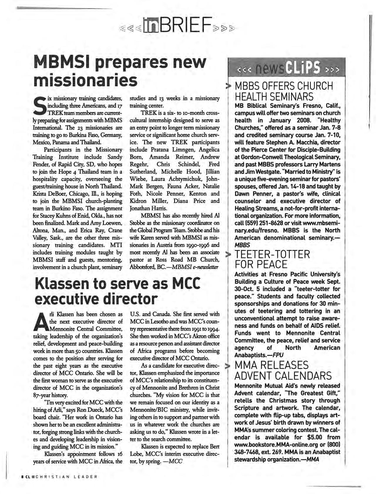 MB Biblical Seminary's Fresno, Calif., campus will offer two seminars on church health in January 2008. "Healthy Churches," offered as a seminar Jan. 7-8 and credited seminary course Jan. 7-10, will feature Stephen A. Macchia, director of the Pierce Center for Disciple-Building at Gordon-Conwell Theological Seminary, and past MBBS professors Larry Martens and Jim Westgate. "Married to Ministry" is a unique five-evening seminar for pastors' spouses, offered Jan. 14-18 and taught by Dawn Penner, a pastor's wife, clinical counselor and executive director of Healing Streams, a not-for-profit international organization. For more information, call (559) 251-8628 or visit www.mbseminary.edu/fresno. MBBS is the North American denominational seminary.14885
