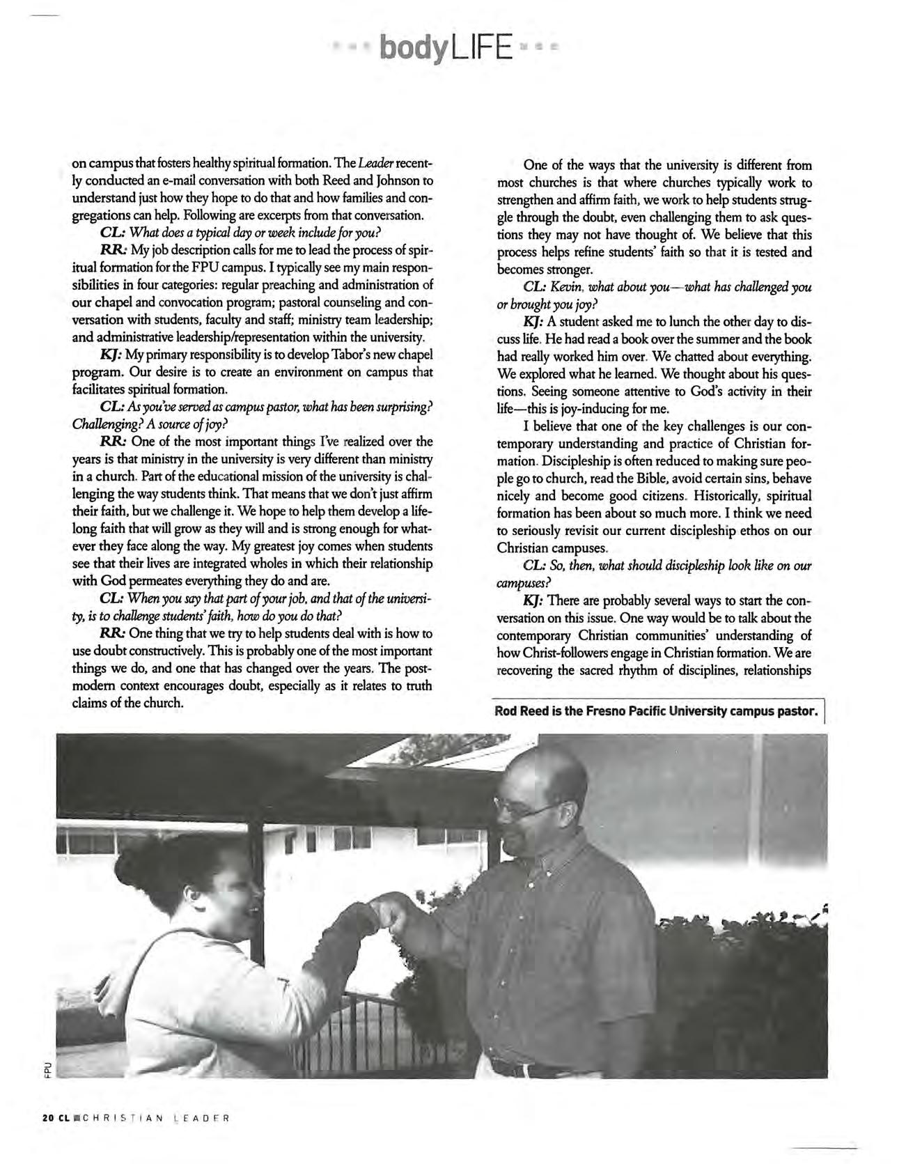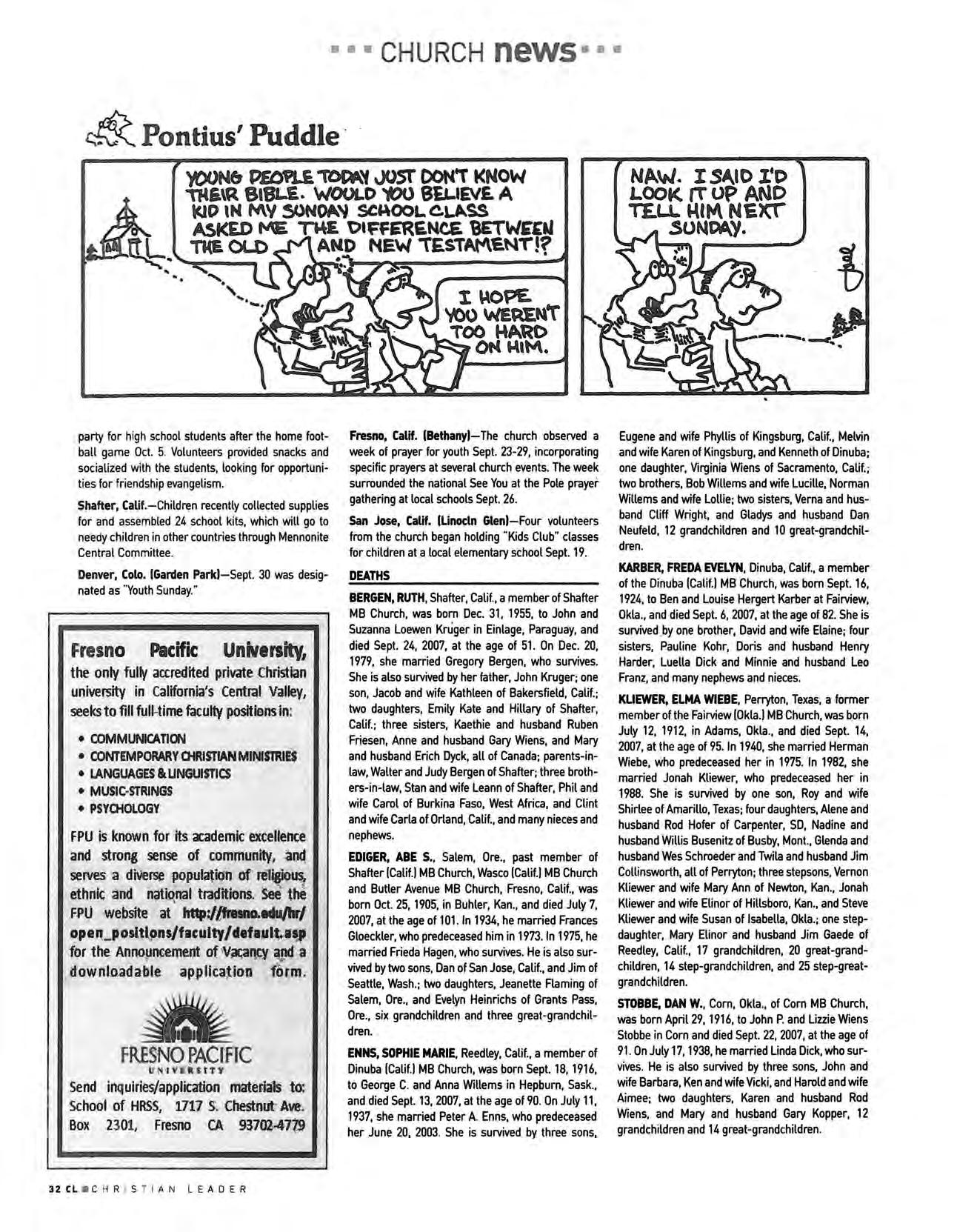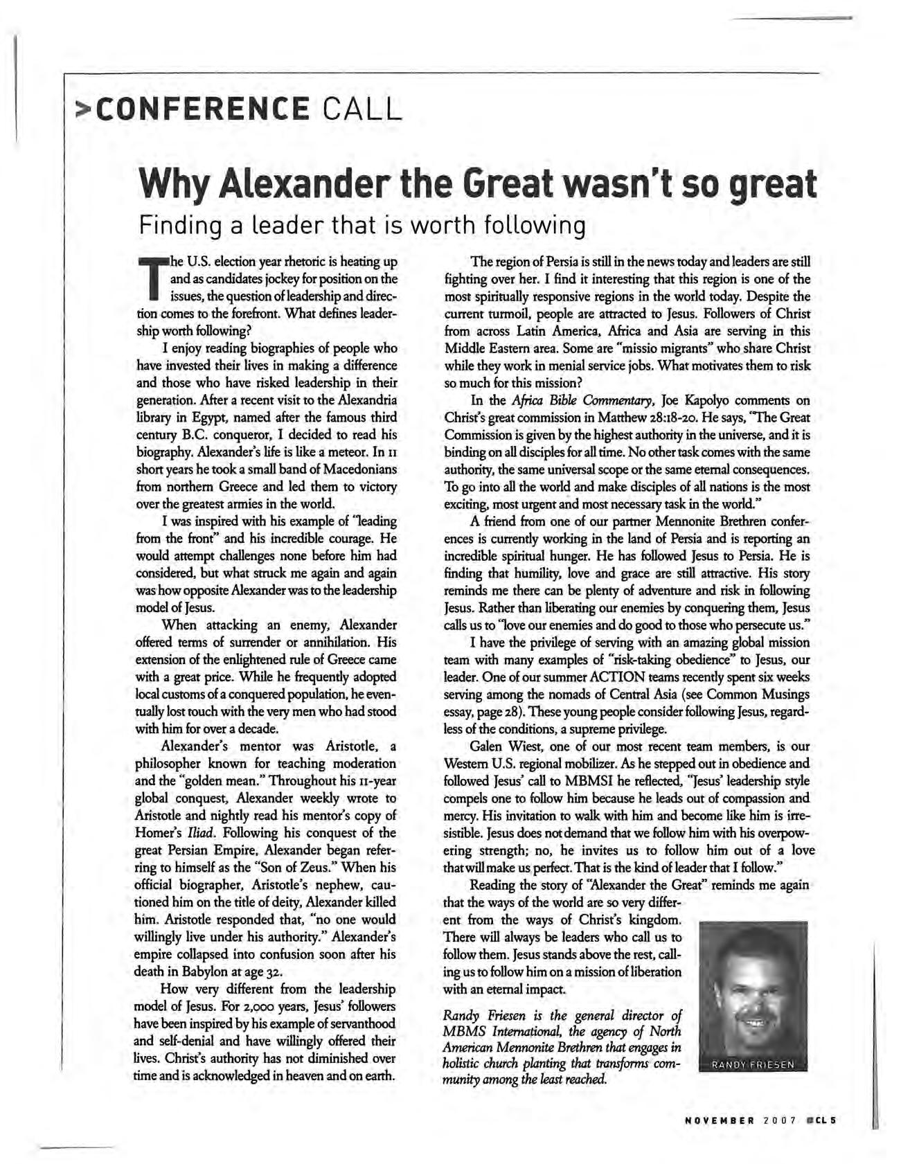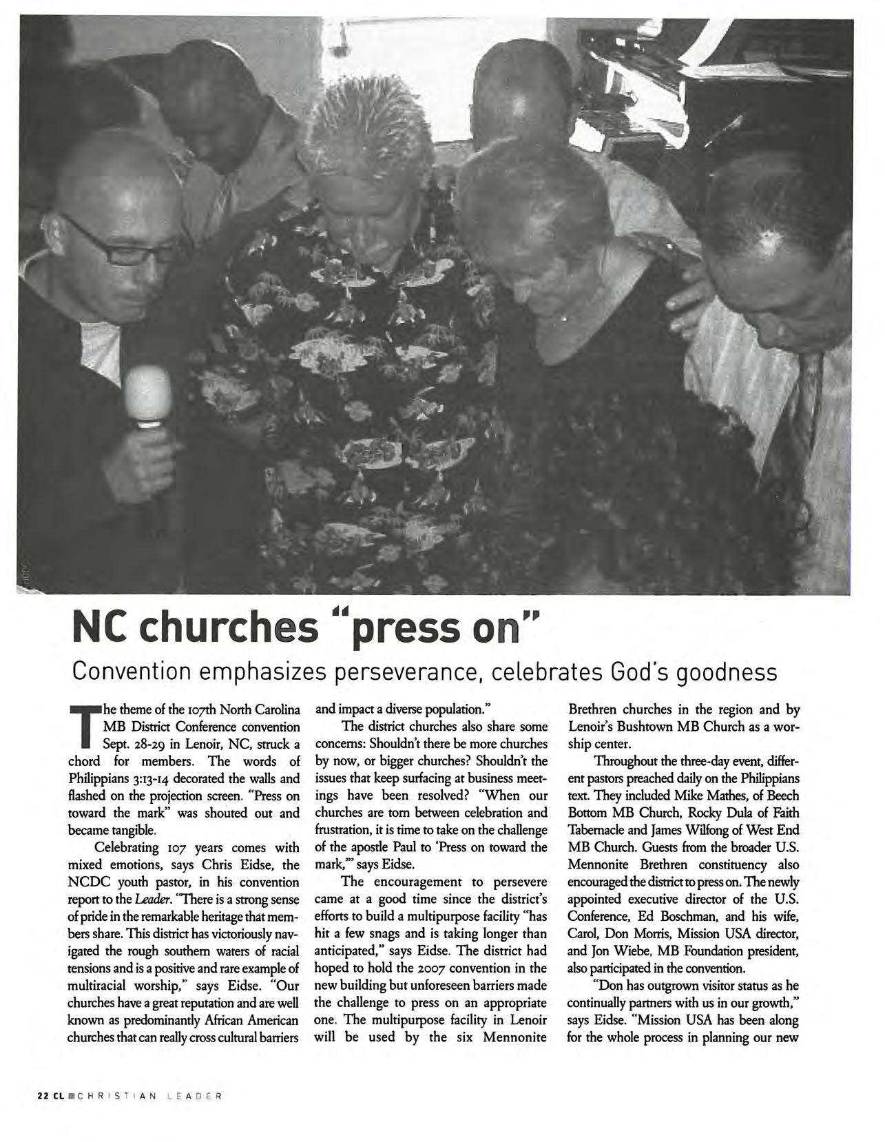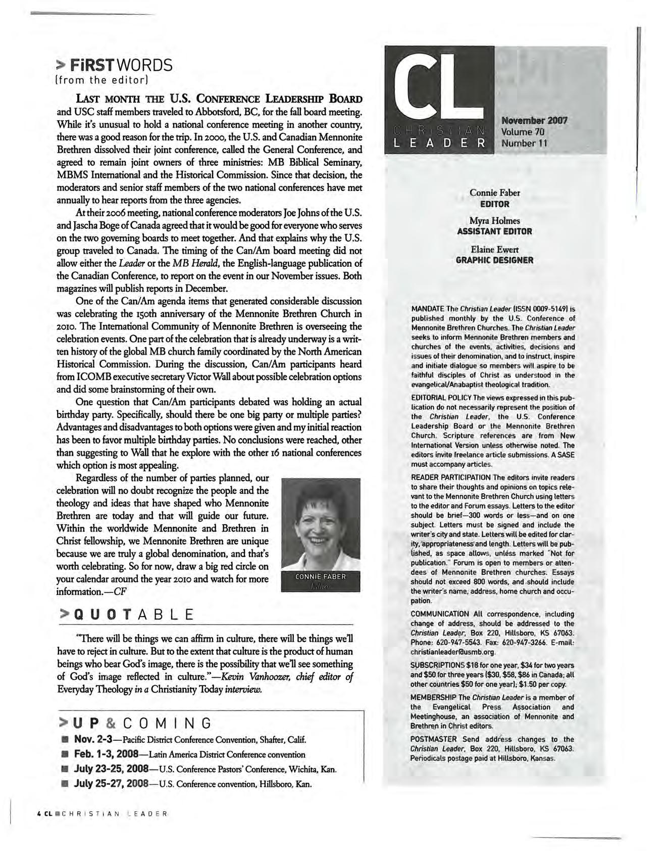 MANDATE Th e Christia n Leader USSN 0009- 5149\ is publi s h ed monthly by the U S Conference o f Mennonite Brethren Churches The Christian Leader seeks to inform Mennonite Brethren members and churches of the events, activi t ies, decis ions and i ssues of their denomination, and to instruct, inspire an d initiate dialogue so members witt aspire to be fai thful disciples of Christ as understood in the evangelicaVAnabapti st theological tradition