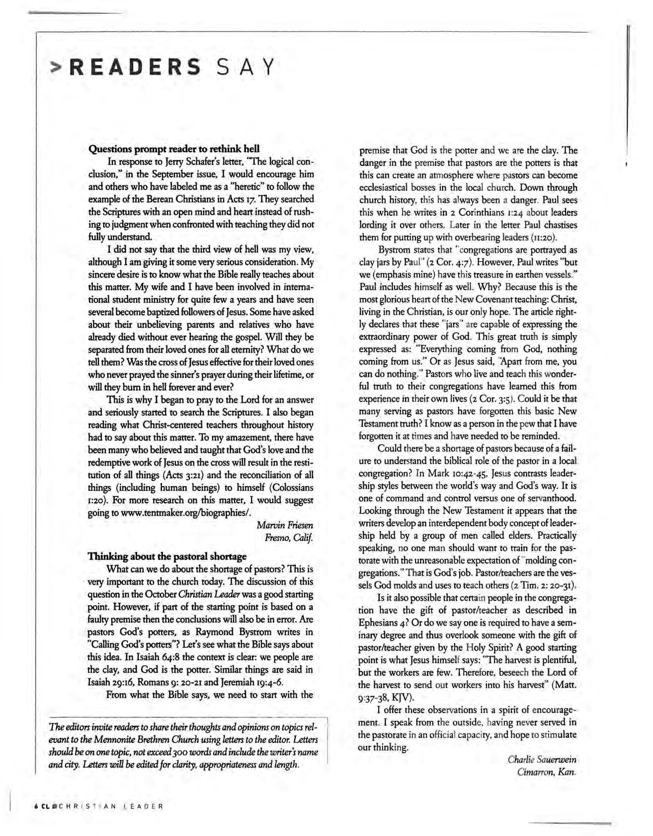 What can we do about the shortage of pastors? This is very important to the church today. The discussion of this question in the October Christian Leader was a good starting point. However, if part of the starting point is based on a faulty premise then the conclusions will also be in error. Are pastors God's potters, as Raymond Bystrom writes in "Calling God's potters"? Let's see what the Bible says about this idea. In Isaiah 64:8 the context is clear: we people are the clay, and God is the potter. Similar things are said in Isaiah 29:16, Romans 9: 20-21 and Jeremiah 19:4-6