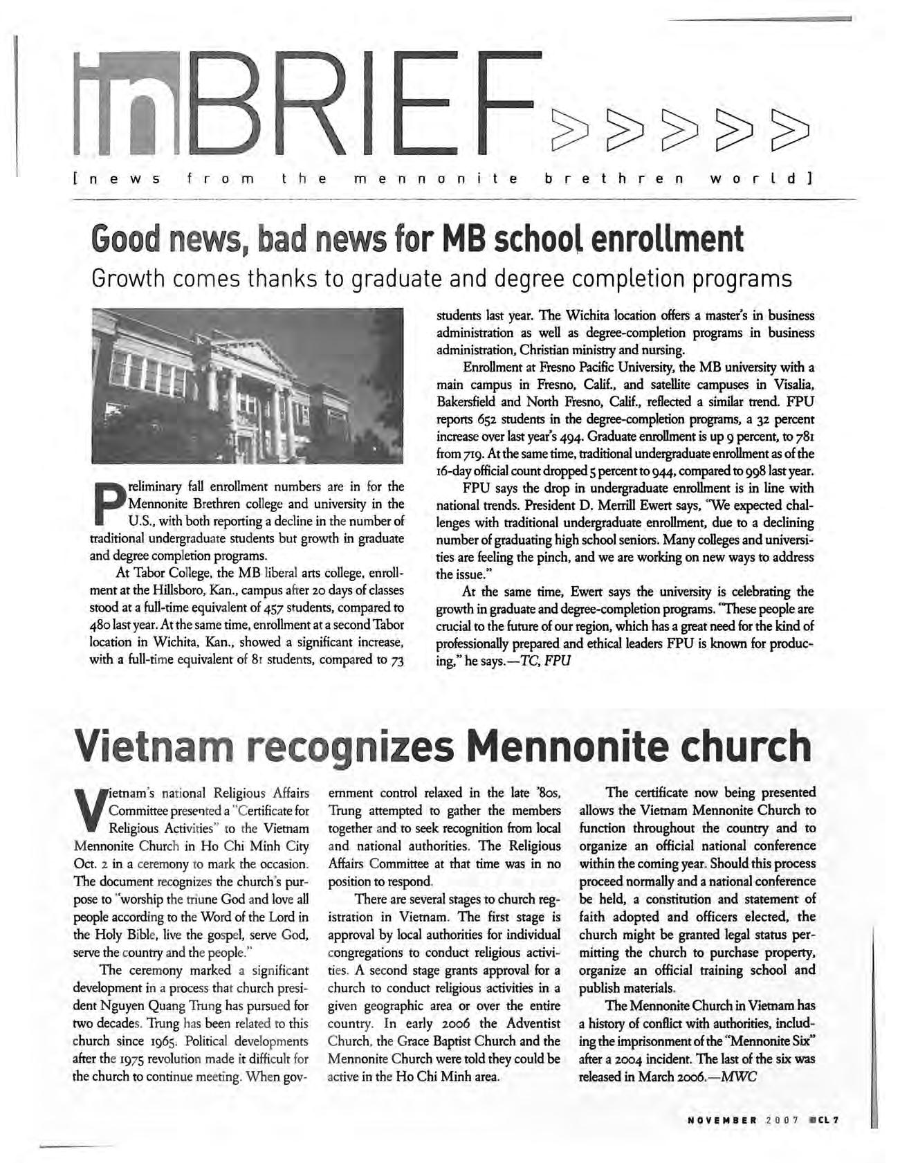 Preliminary fall enrollment numbers are in for the Mennonite Brethren college and university in the U.S., with both reporting a decline in th e number of