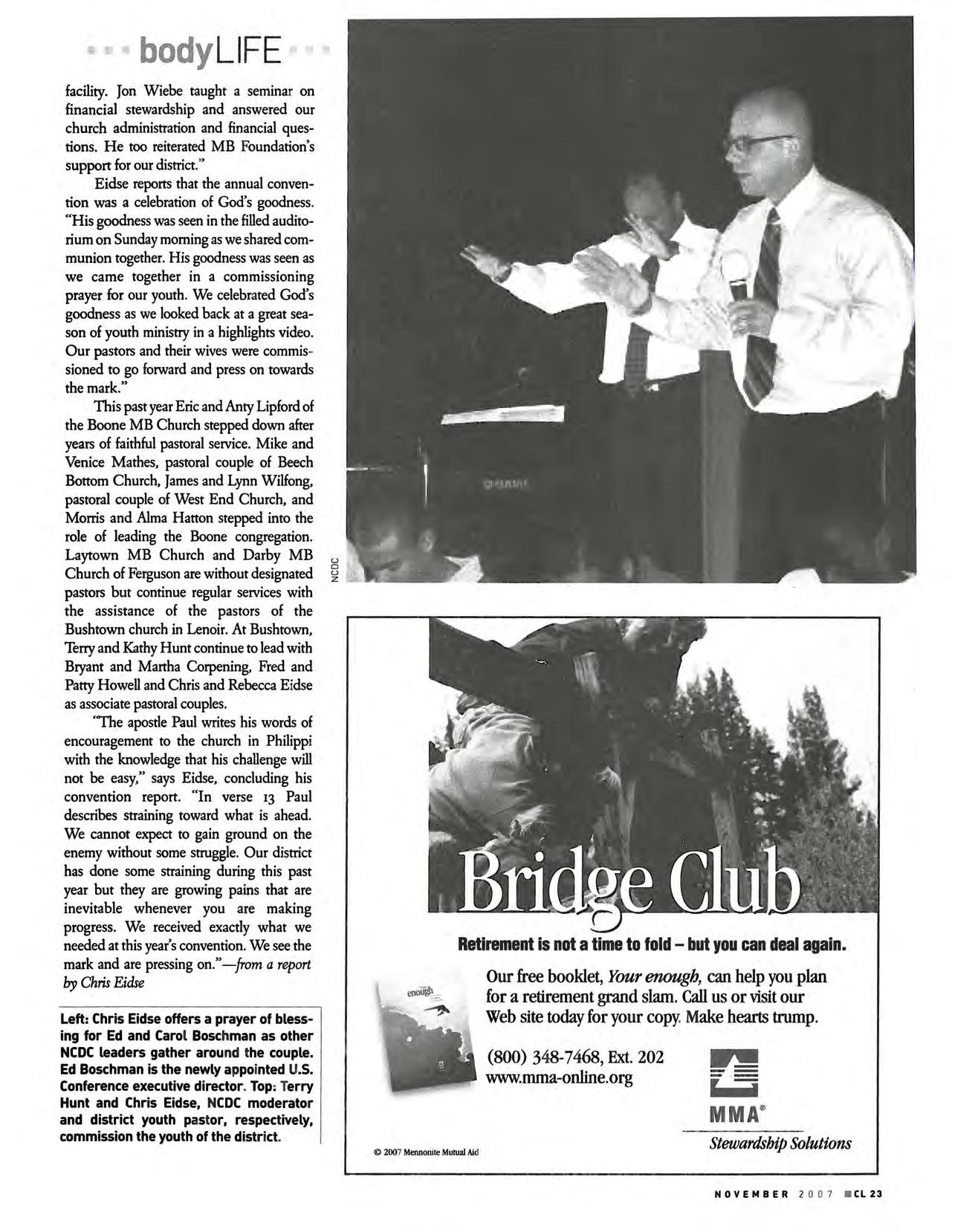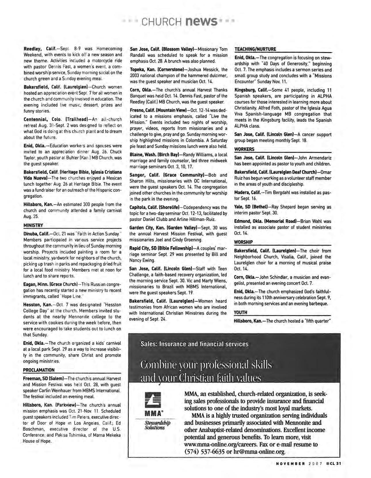 Corn, Okla.-The church's annual Harvest Thanks Banquet was he l d Oct. 14 Dennis Fast, pastor of the Reedley [Calif.J MB Chu rc h. was the guest speaker. Fresno, Calif. (Mountain View) - Oct. 12- 14 was dedicated to a missions emphasis , called " Live the Mission " Events included two nigh ts of worship. prayer, videos, reports from missionaries and a challenge to give. pray and go Sunday morning worship highlighted missions in Colombia A Saturday pie feast and Sunday missions lunch were also held Blaine, Wash. (Birch Bay)-Randy Williams. a local marriage and family counselor led three midweek ma rr iage seminars Oct. 3. 10. 17.