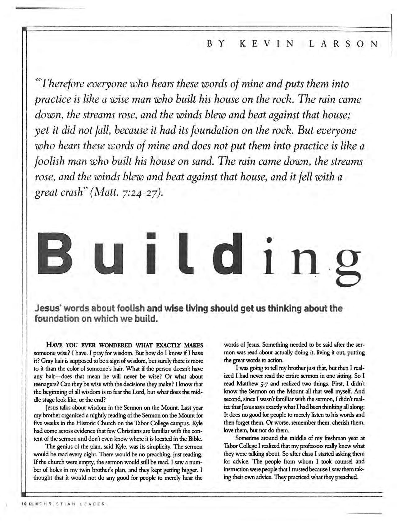 Jesus talks about wisdom in the Sermon on the Mount. Last year my brother organized a nightly reading of the Sermon on the Mount for five weeks in the Historic Church on the Tabor College campus . Kyle had come across evidence that few Christians are familiar with the content of the sermon and don't even know where it is located in the Bible. The genius of the plan, said Kyle, was its simplicity. The sermon would be read every night There would be no preaching, just reading. If the church were empty, the sermon would still be read. I saw a number of holes in my twin brother's plan , and they kept getting bigger. I thought that it would not do any good for people to merely hear the