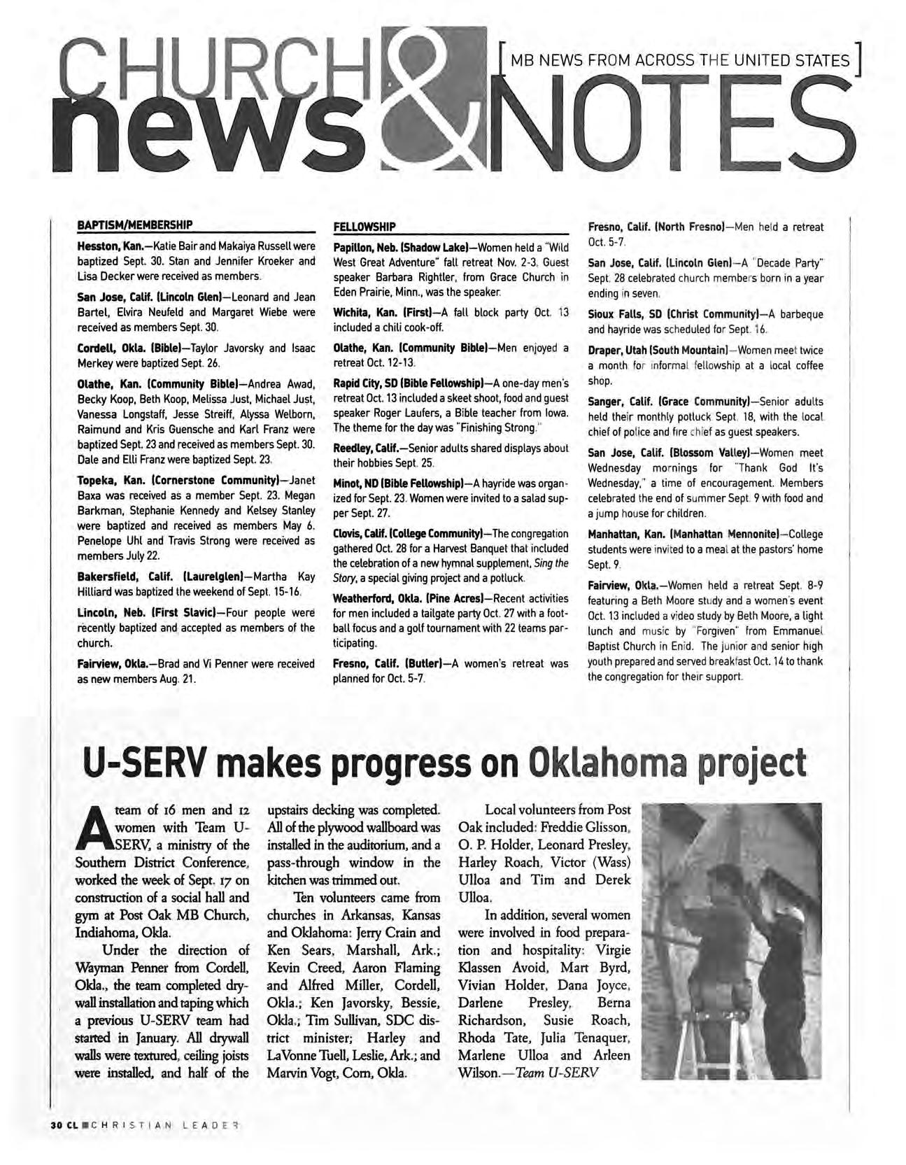 of 16 men and 12 women with Team UERY. a ministry of the Southern District Conference worked the week of Sept. 17 on construction of a social hall and gym at Post Oak MB Church, Indiahoma. Okla . Under the direction of Wayman Penner from Cordell. Okla the team completed drywall installation and taping which a previous U-SERV team had started in January. All drywall walls were textured ceiling joists were installed. and half of the