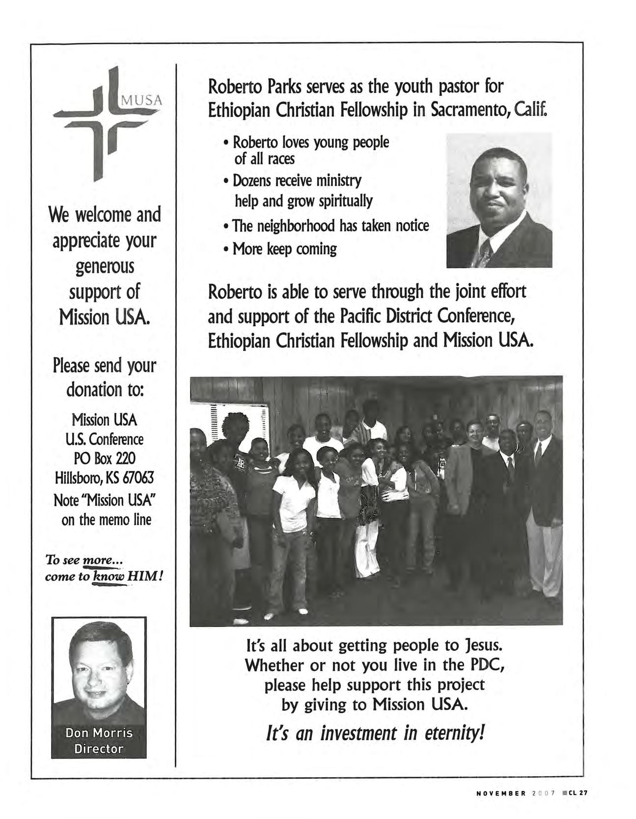Hillsboro, Kan (Par kv iew) -The church 's annual missio n emphasis was Oc t. 21 - Nov 11 Scheduled gu est speak ers includ ed Tim Peters, executive directo r of Door of Hope in Los Ange l es Ca l if.; Ed Boschma n exe cutiv e direct or of th e U.s Co nfere nce ; and Pak isa Tshim ika, of Ma ma Me keka House of Hope