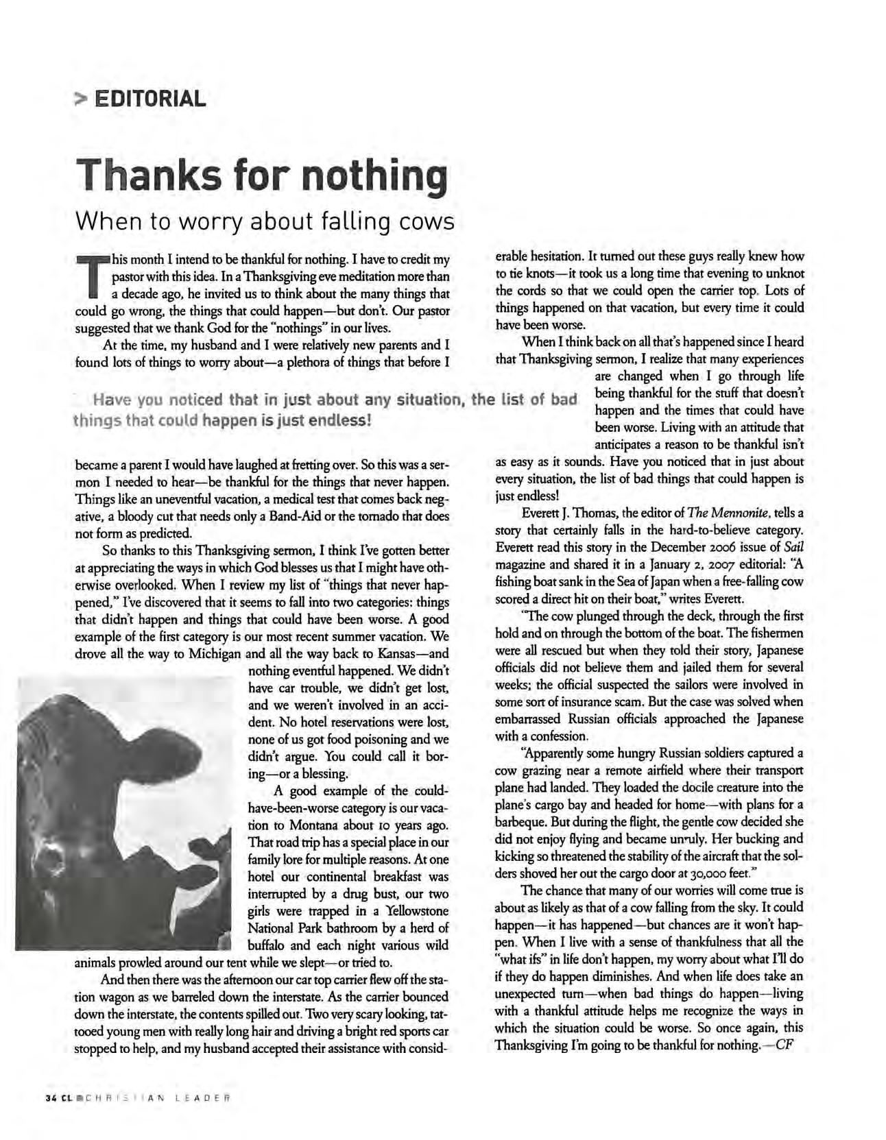 The chance that many of our worries will come true is about as likely as that of a cow falling ftom the sky. It could happen-it has happened - but chances are it won't happen When I live with a sense of thankfulness that all the "what ifs" in life don't happen, my worry about what 111 do if they do happen diminishes. And when life does take an unexpected tum - when bad things do happen - living with a thankful attitude helps me recognize the ways in which the situation could be worse. So on ce again, this Thanksgiving I'm going to be thankful for nothing. - CF