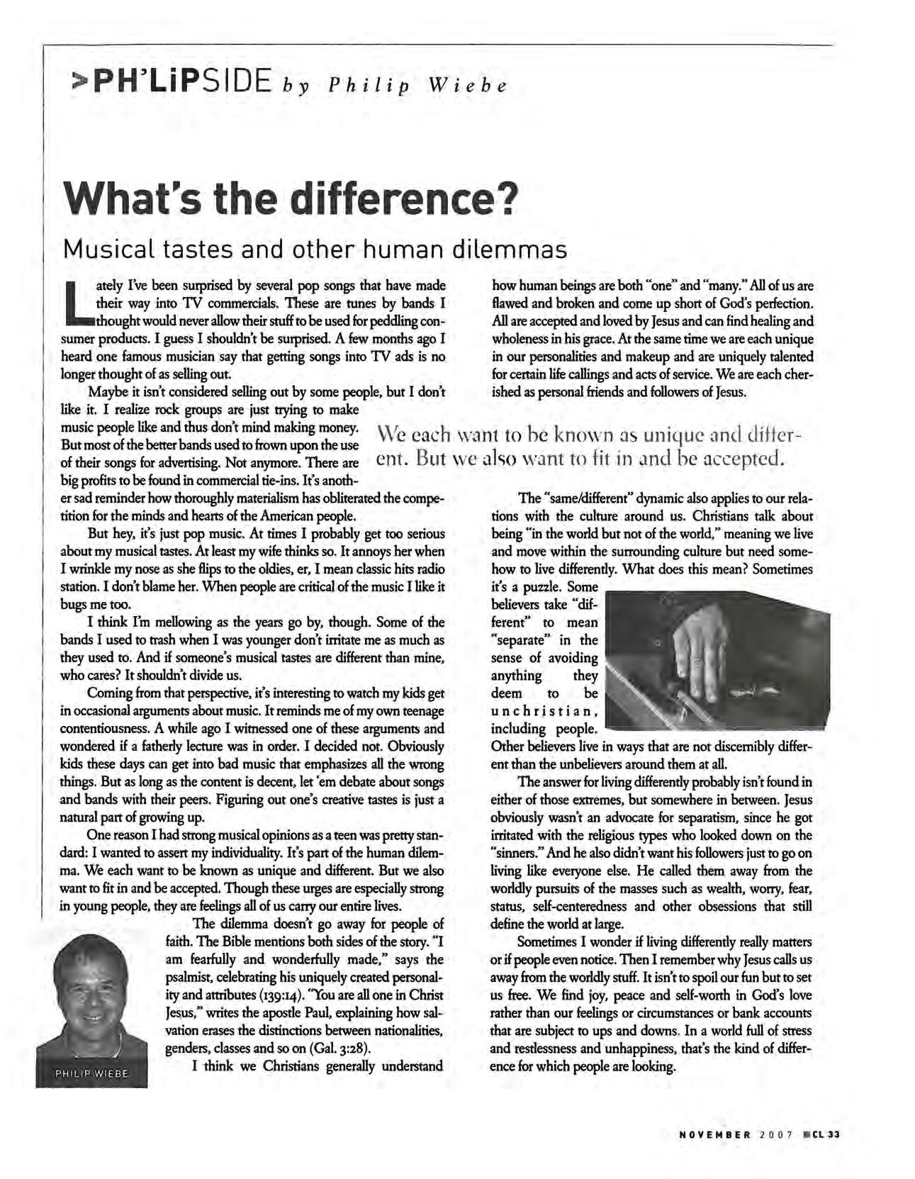 The "same/different" dynamic also applies to our relations with the culture around us. Christians talk about being "in the world but not of the world," meaning we live and move within the surrounding culture but need somehow to live differently. What does this mean? Sometimes it's a puzzle. Some believers take "different" to mean "separate" in the sense of avoiding anything they deem to be unchristian, including people.