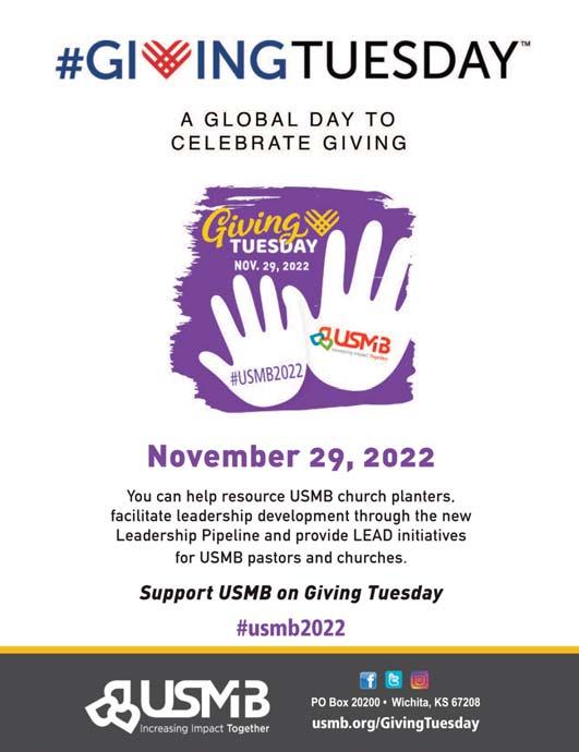 Individuals and churches will have opportunity to support USMB on Giving Tuesday, Nov. 29, 2022. Giving Tuesday is a global day dedicated to generosity that falls on the first Tuesday after Thanksgiving, Black Friday and Cyber Monday.
