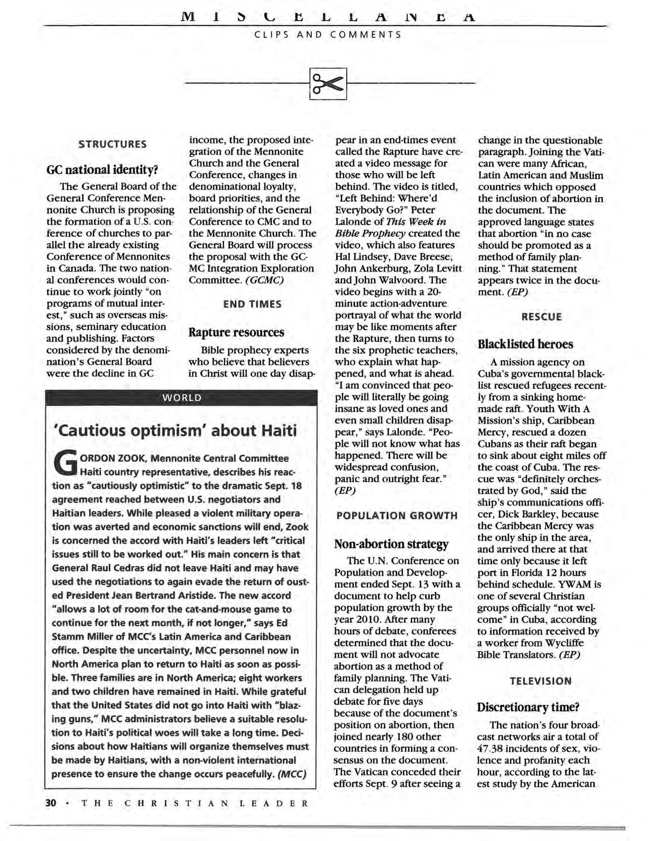 Haiti country representative, describes his reaction as "cautiously optimistic" to the dramatic Sept. 18 agreement reached between U.S. negotiators and Haitian leaders. While pleased a violent military operation was averted and economic sanctions will end, Zook is concerned the accord with Haiti's leaders left "critical issues still to be worked out. " His main concern is that General Raul Cedras did not leave Haiti and may have used the negotiations to again evade the return of ousted President Jean Bertrand Aristide. The new accord "allows a lot of room for the cat-and-mouse game to continue for the next month, if not longer," says Ed Stamm Miller of MCC's Latin America and Caribbean office. Despite the uncertainty, MCC personnel now in North America plan to return to Haiti as soon as possible. Three families are in North America; eight workers and two children have remained in Haiti. While grateful that the United States did not go into Haiti with "blazing guns," MCC administrators believe a suitable resolution to Haiti's political woes will take a long time. Decisions about how Haitians will organize themselves must be made by Haitians, with a non-violent international presence to ensure the change occurs peacefully. (MCC)