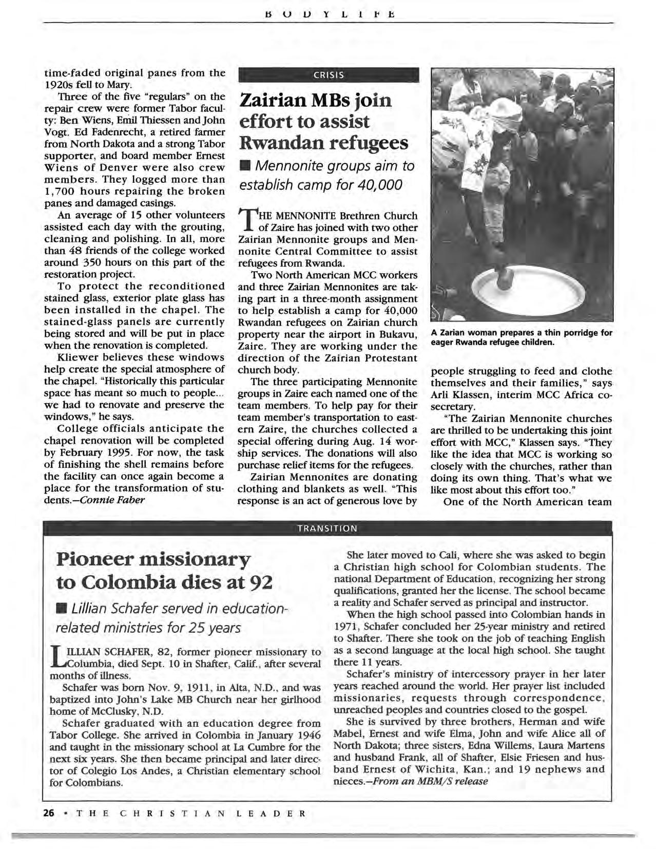 ART CREDITS: Cover and page 5, Rohn Engh,' page 8, Ed Wallowitch; page 11, Dynamic Graphics; page 21, photo courtesy of Ric Hallock of the Lynden (Wash.) Tribune; pages 23-24, Tabor College photos by Orley Friesen ; page 26, Don Edkins/WCC/MCC.