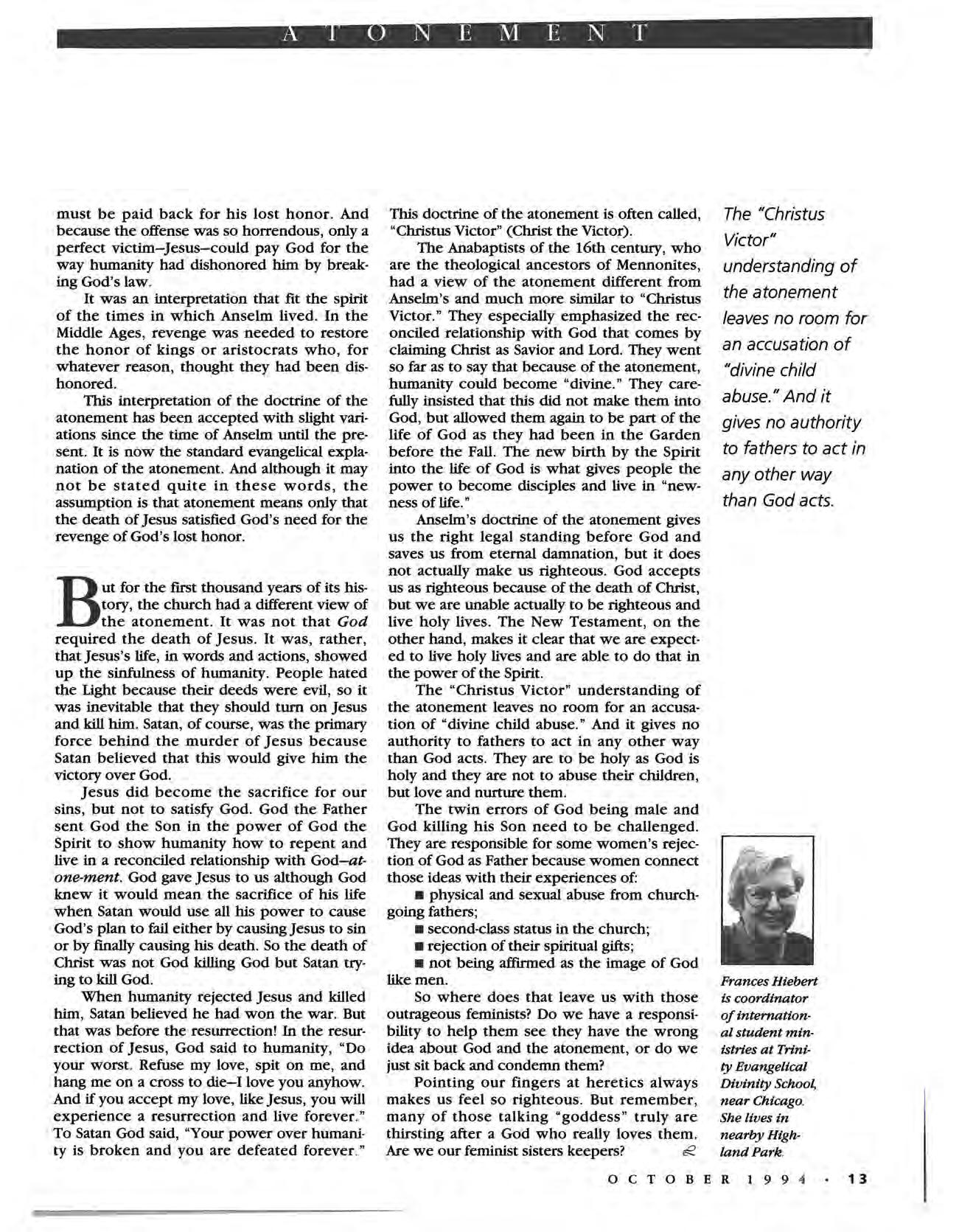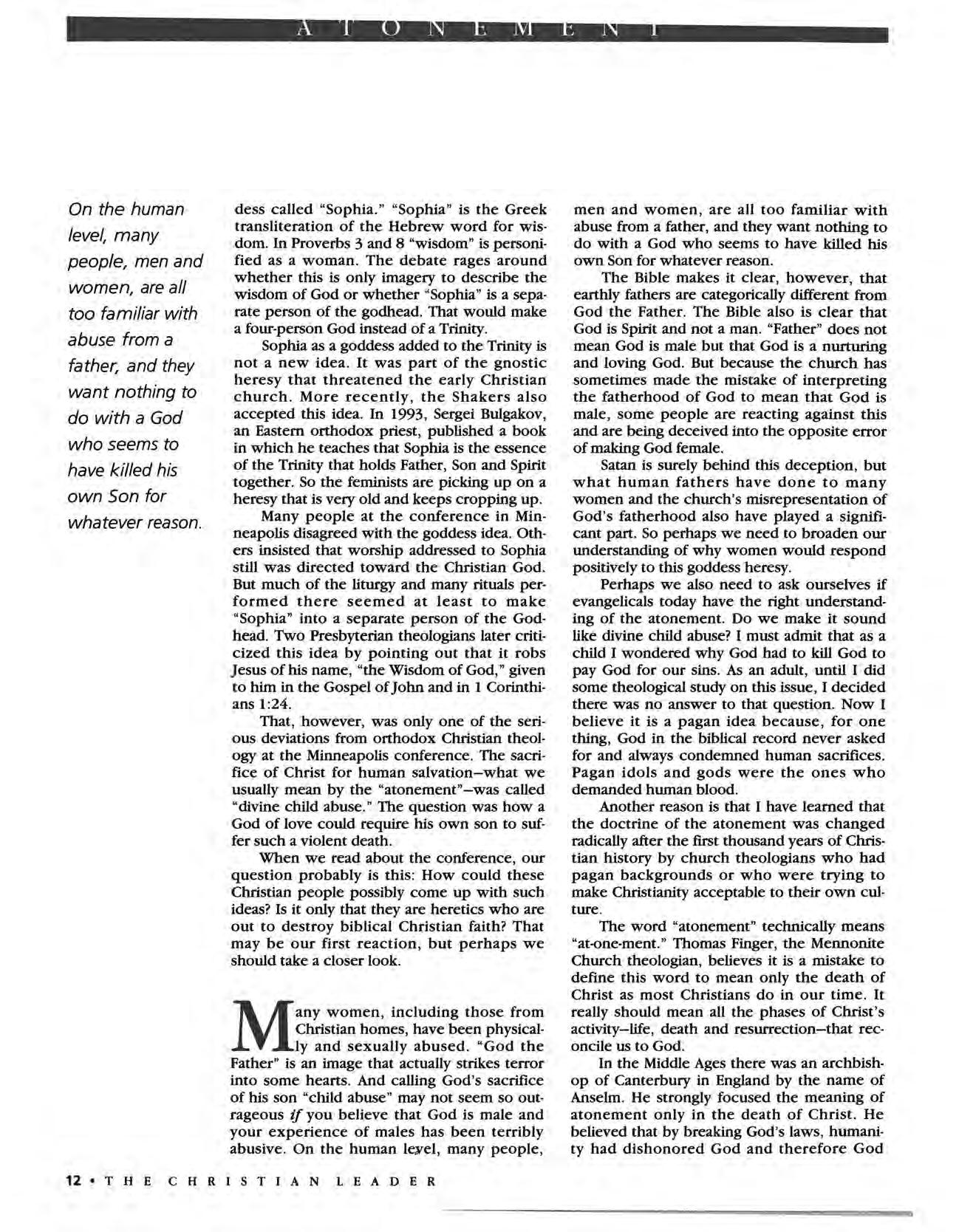 Frances Hiebert explores one of the issues behind the controversial Re-Imagining conference held last fall. Some participants were accused of denying orthodox faith and promoting heresy . Is the concept of atonement, as it's popularly understood, really an example of "divine child abuse," as some conference participants alleged? Be pro· voked to think as you read her article, which begins on page 11.