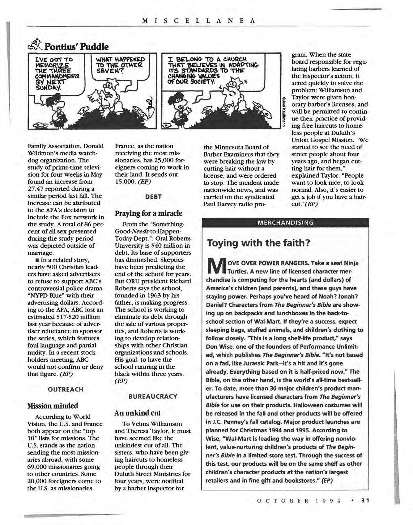 MOVE OVER POWER RANGERS. Take a seat Ninja Turtles. A new line of licensed character merchandise is competing for the hearts (and dollars) of America's children (and parents), and these guys have staying power. Perhaps you've heard of Noah? Jonah? Daniel? Characters from The Beginner's Bible are showing up on backpacks and lunch boxes in the back-toschool section of Wal-Mart. If they're a success, expect sleeping bags, stuffed animals, and children's clothing to follow closely. "This is a long shelf-life product," says Don Wise, one of the founders of Performance Unlimited, which publishes The Beginner's Bible. "It's not based on a fad, like Jurassic Park-it's a hit and it's gone already. Everything based on it is half-priced now." The Bible, on the other hand, is the world's all-time best-seller. To date, more than 30 major children's product manufacturers have licensed characters from The Beginner's Bible for use on their products. Halloween costumes will be released in the fall and other products will be offered in J.e. Penney's fall catalog. Major product launches are planned for Christmas 1994 and 1995. According to Wise, "Wal-Mart is leading the way in offering nonviolent, value-nurturing children ' s products of The Beginner's Bible in a limited store test. Through the success of this test, our products will be on the same shelf as other children's character products at the nation's largest retailers and in fine gift and bookstores." (EP)
