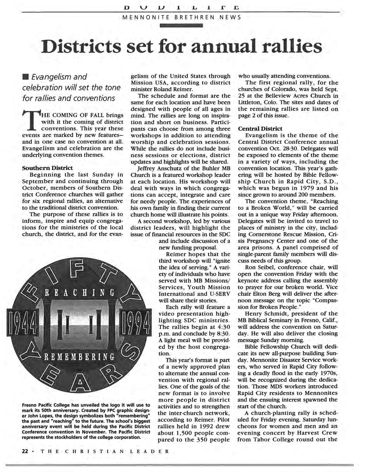 MANDATE: THE CHRISTIAN LEADER (ISSN 00095149), organ of the U.S Conference of Mennonite Brethren Churches, is published monthly by the U S Conference Board of Communications, 315 S. Lincoln, Hillsboro, KS 67063. The Christian Leader seeks to inform Mennonite Brethren members and churches of the events, activities, decisions, and issues of their denomination, and to instruct, inspire and initiate dialog so that they will aspire to be faithful disciples of Christ as understood in the evangelical! Anabaptist theological tradition.