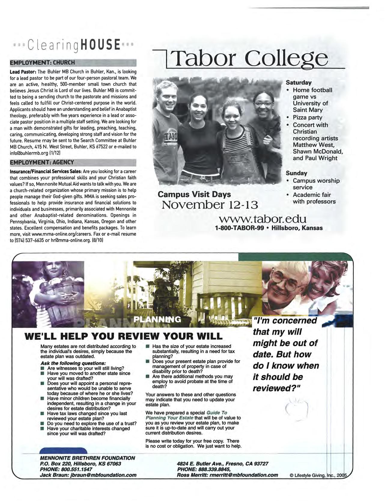 Lead Pastor: The Buhler MB Church in Buhler, Kan , is looking for a lead pastor to be part of our four - pe rson pasto ral team. We are an act ive, healthy, 500-member small town church that believes Jesus Christ is Lord of ou r lives Buhler MB is comm itted to being a sending church to the pastorate and missions and feels called to fulfill our Christ-centered pu r pose in t he worl d. Applicants should have an understand ing and belief in Anabapt ist theology, prefe rably with five years experience in a lead or associate pastor position in a multiple staff setting. We are looking for a man with demonst rate d gifts for leading , preaching , teaching, caring , commun icating, developing strong staff and vi sion for the future Resume may be sent to the Search Committee at Buh ler MB Chu rch , 415 N West St reet, Buhler, KS 67522 or e-mailed to inforclbuhlermb.org (1/12J
