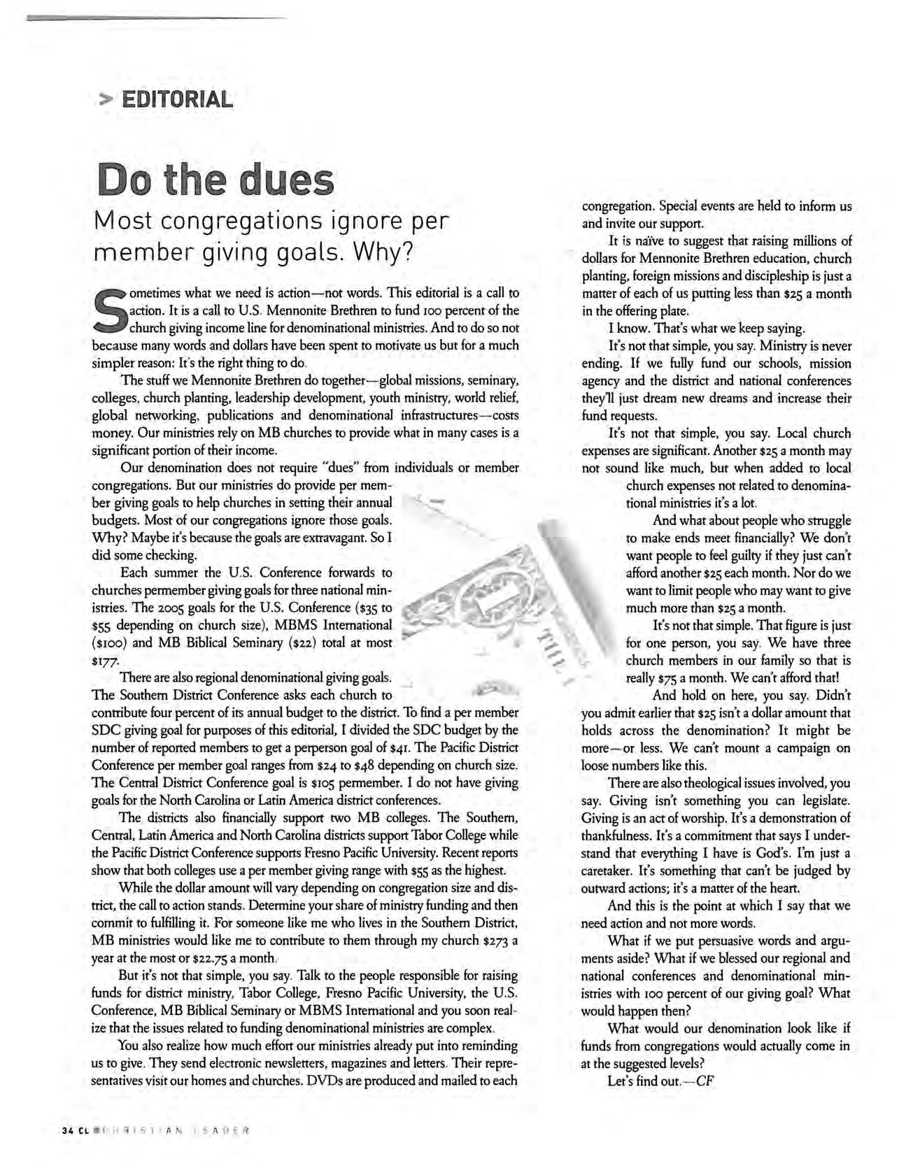 It is naYve to suggest that raising millions of dollars for Mennonite Brethren education, church planting , foreign missions and discipleship is just a matter of each of us putting less than $25 a month in the offering plate