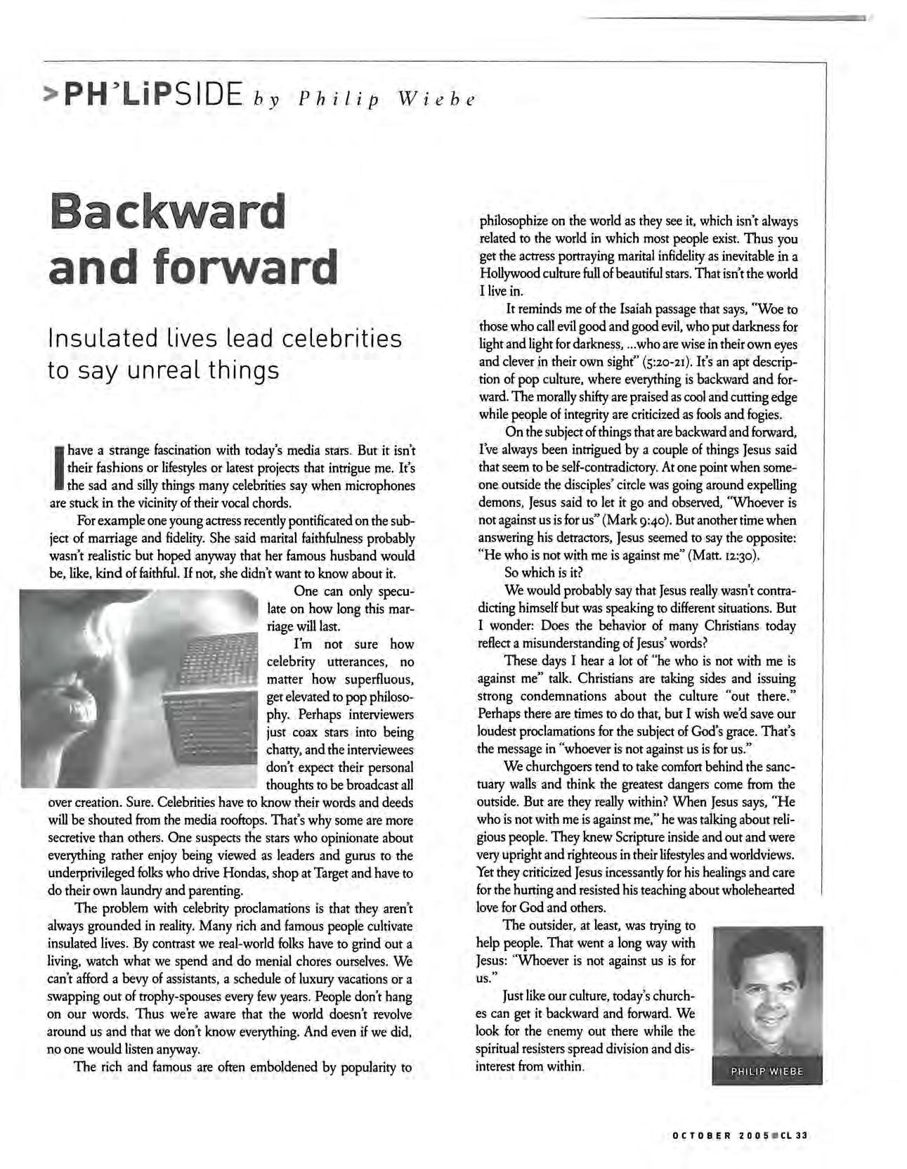 It reminds me of the Isaiah passage that says, "Woe to those who call evil good and good evil, who put darkness for light and light for darkness, who are wise in their own eyes and clever in their own sight" (5:20-21) It's an apt description of pop culture, where everything is backward and forward. The morally shifty are praised as cool and cutting edge while people of integrity are criticized as fools and fogies.