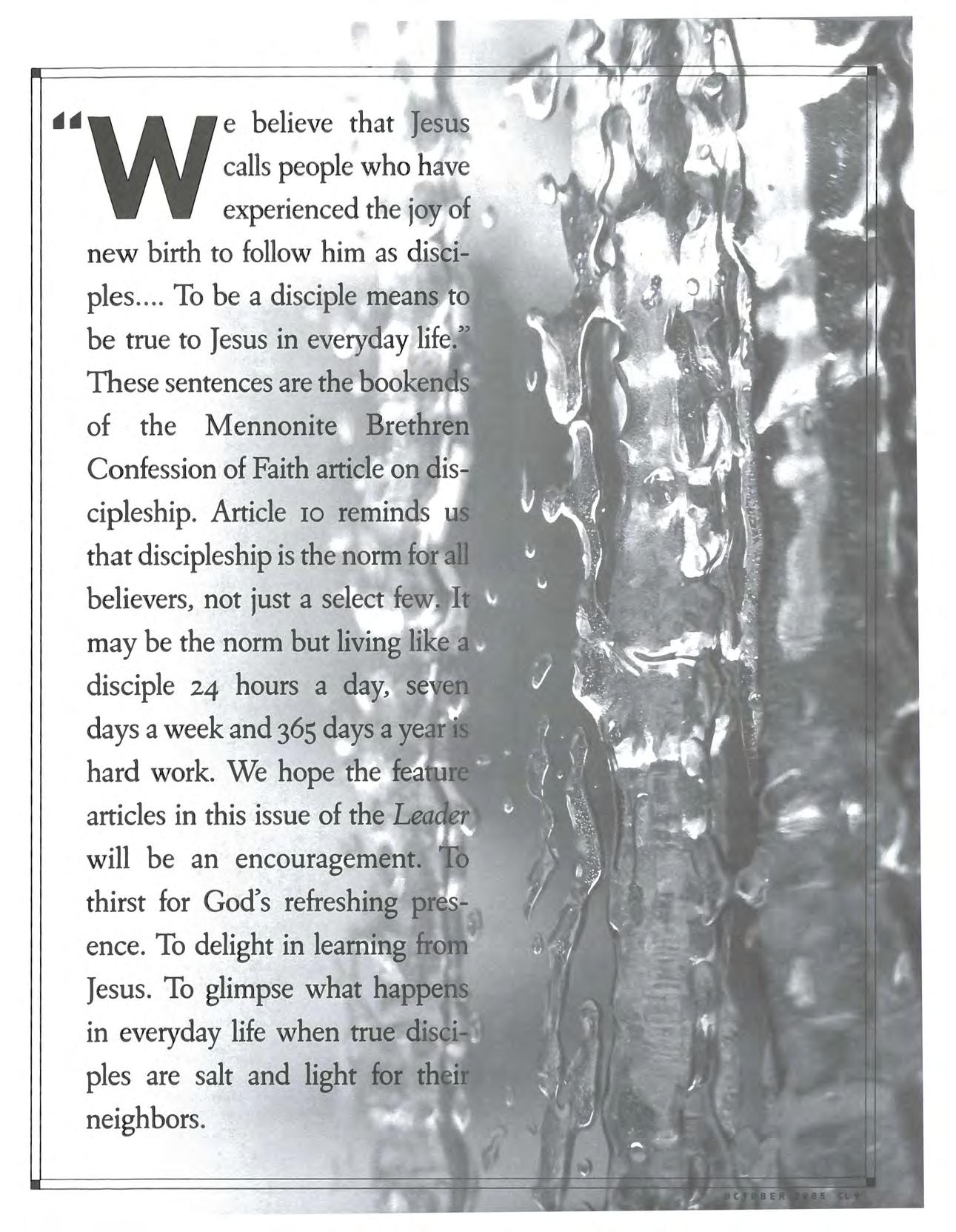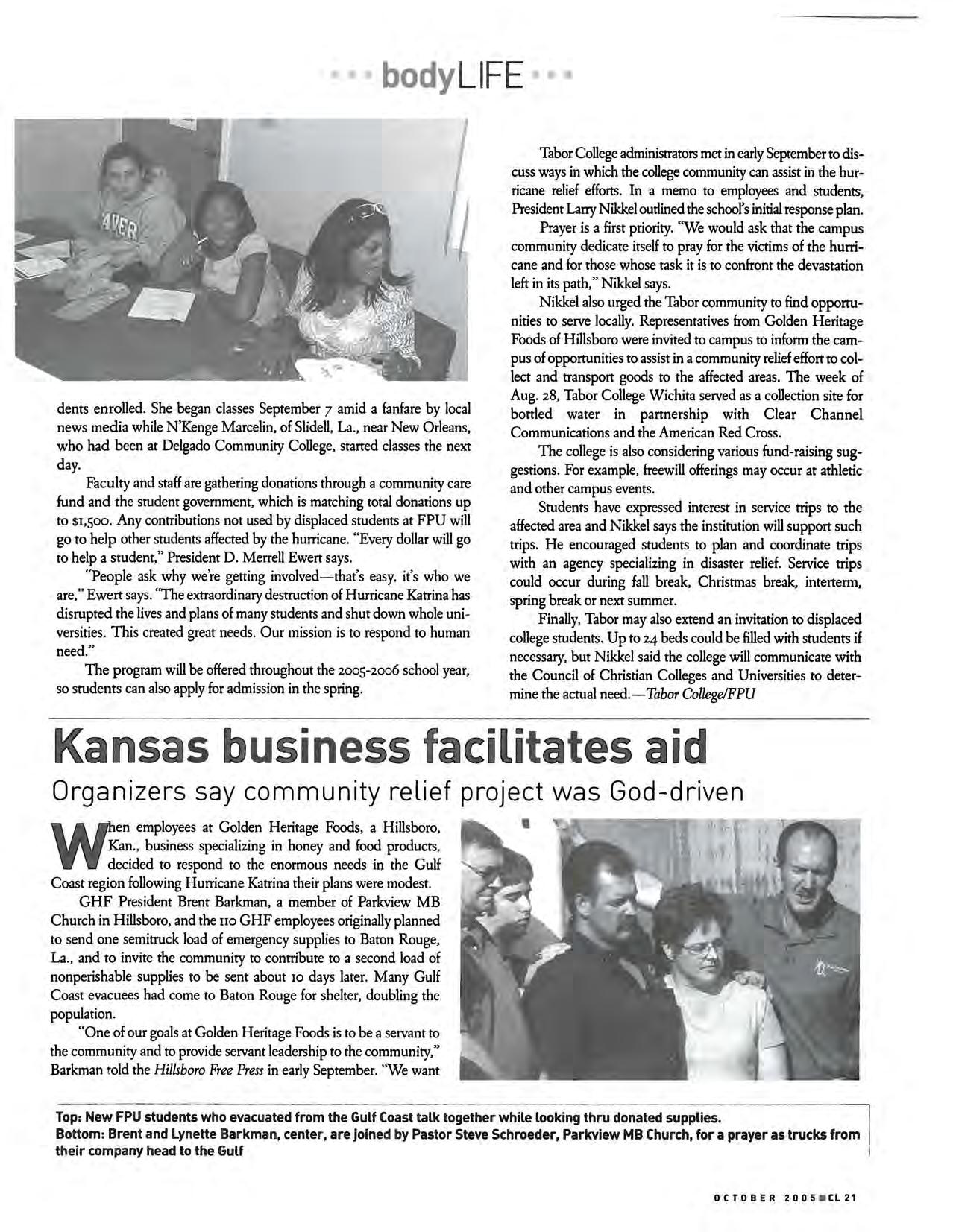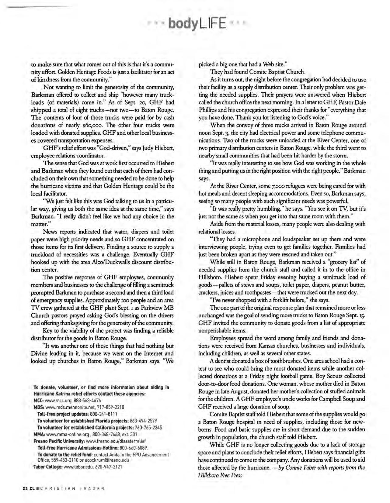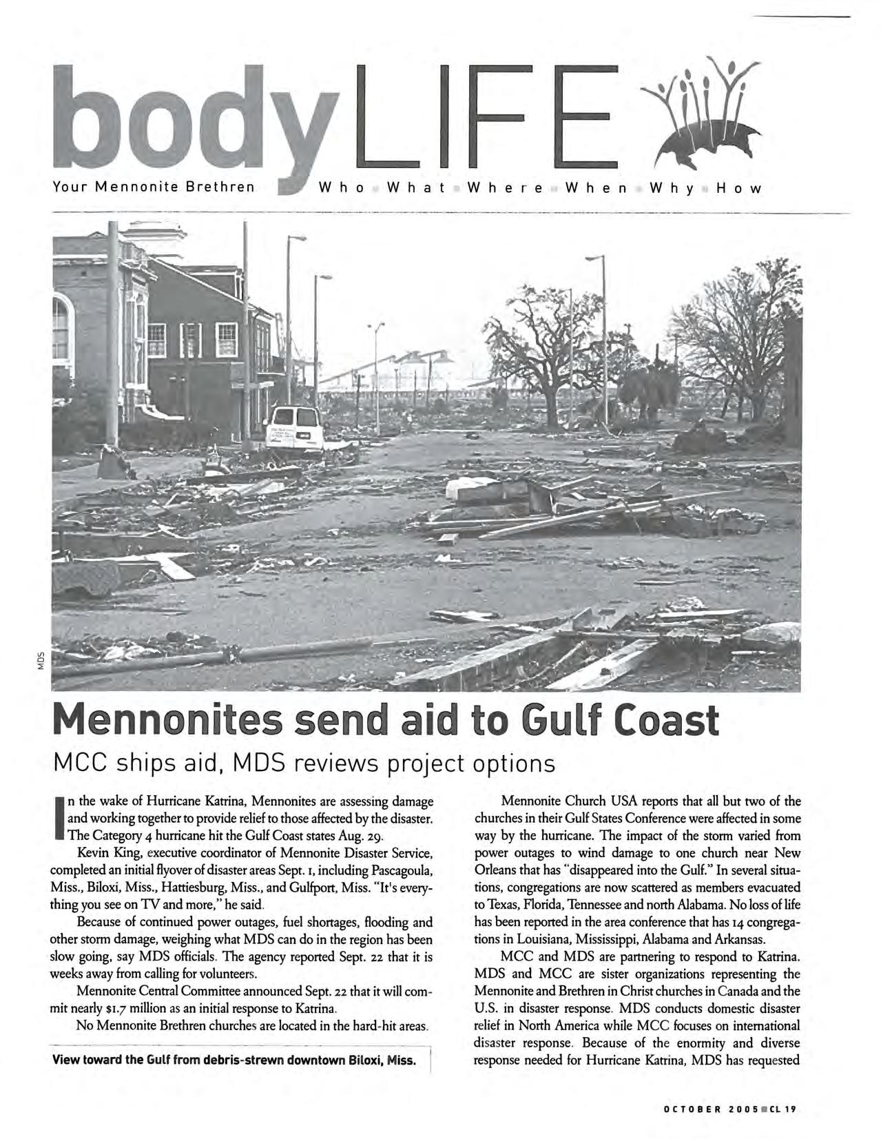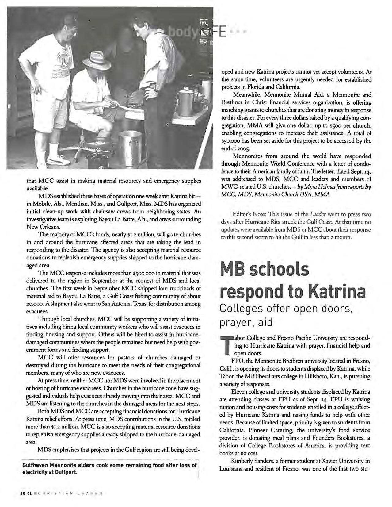 But we hope the information we've included will be new news to many Leader readers. Our articles focus on hurricane news with Mennonite Brethren and Mennonite connections. While there are no MB congregations along the Gulf Coast, there are 14 Gulf Coast Mennonite Conference congregations, members of our sister denomination Mennonite Church USA. And as always, Mennonite Disaster Service staff members were immediately investigating how best to aid in cleanup and rebuilding. Given the thousands of stories being told about surviving Hurricane Katrina and cleaning up in the aftermath, I trust we will connect in a unique way with stories from our Mennonite family.