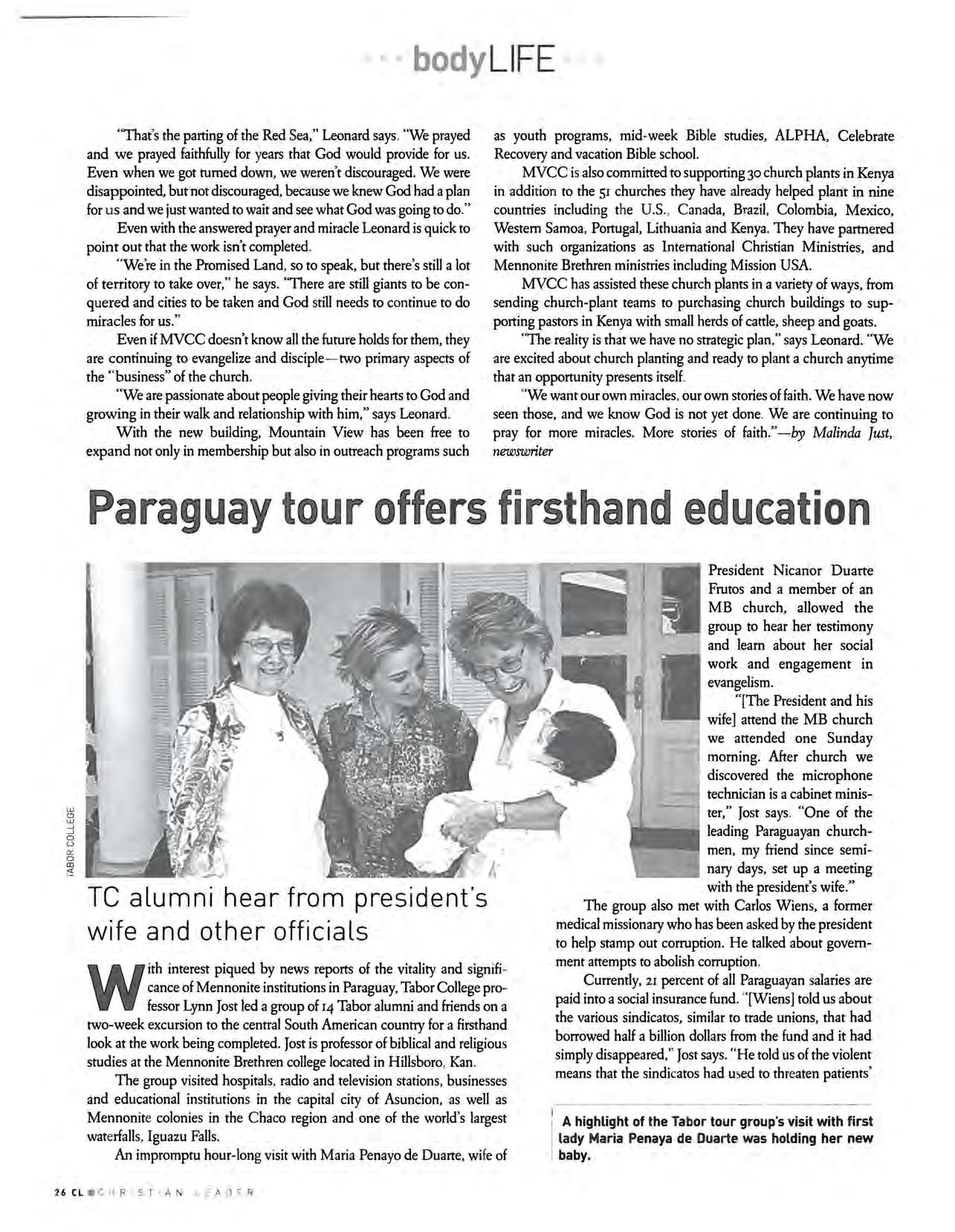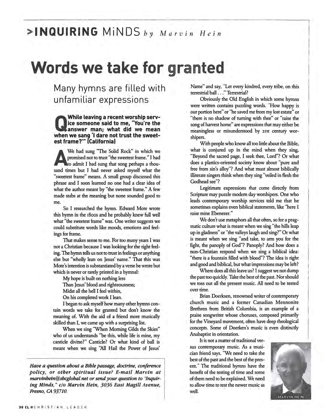 While every issue of the Christian Leader has significant articles and news of interest; after reading the July issue I felt that I should write to simply say thank you. As a seminary alumnus, semi-retired pastor and one who had the privilege of serving on various Canadian and former General Conference boards, it is a blessing to stay in touch with so many brothers and sisters that we know and respect Reading about God's blessing on your churches and conference through leaders like MB Biblical Seminary President Jim Holm; Reedley Pastor Dennis Fast; Executive Director Chuck Buller; former Canadian Rose Buschman and many more has inspired us to join you in praising God for all those who are faithfully serving the Lord