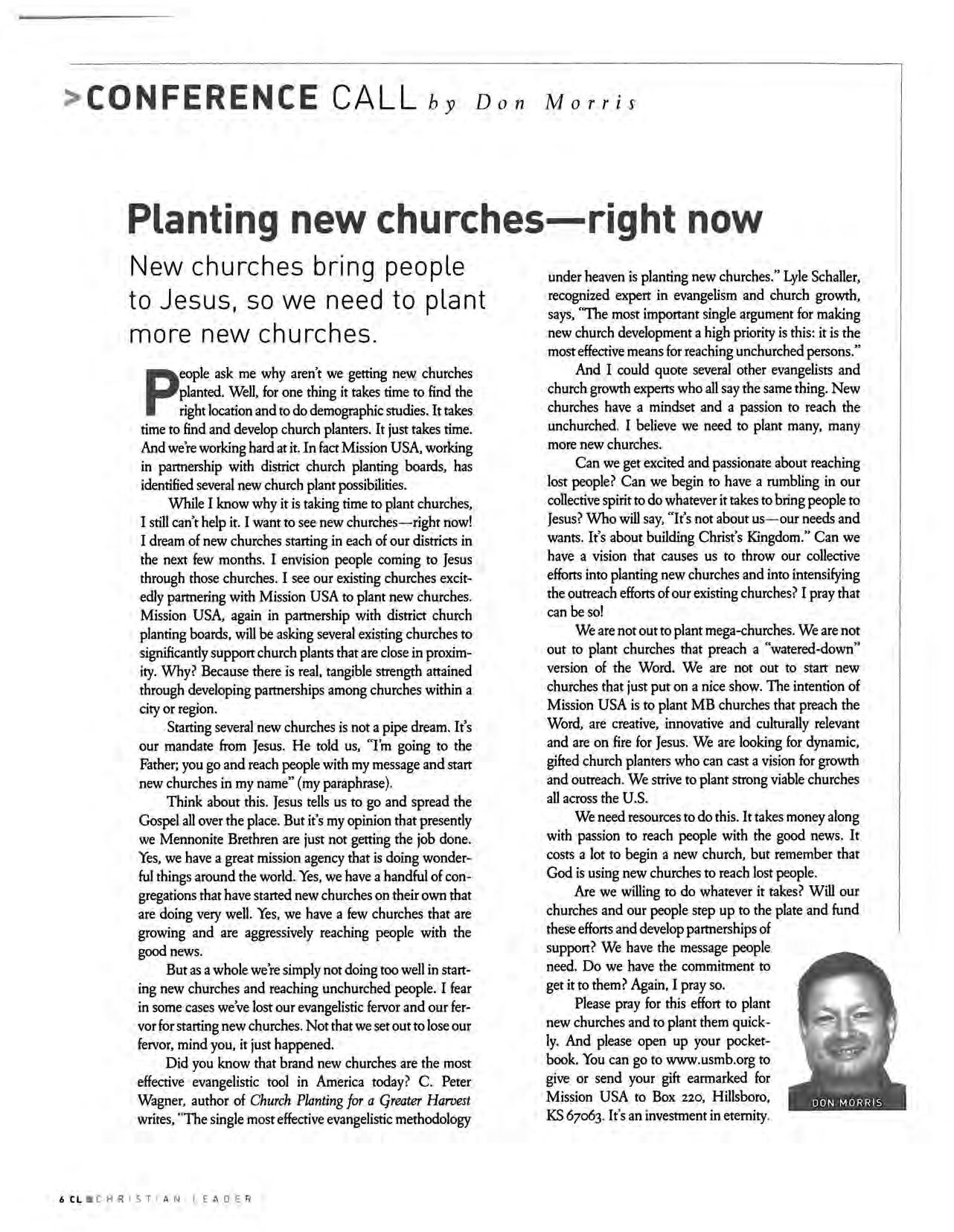 Please pray for this effort to plant new churches and to plant them quickly. And please open up your pocketbook. You can go to www .usmb .org to give or send your gift earmarked for Mission USA to Box 220, Hillsboro , KS 67063 It's an investment in eternity