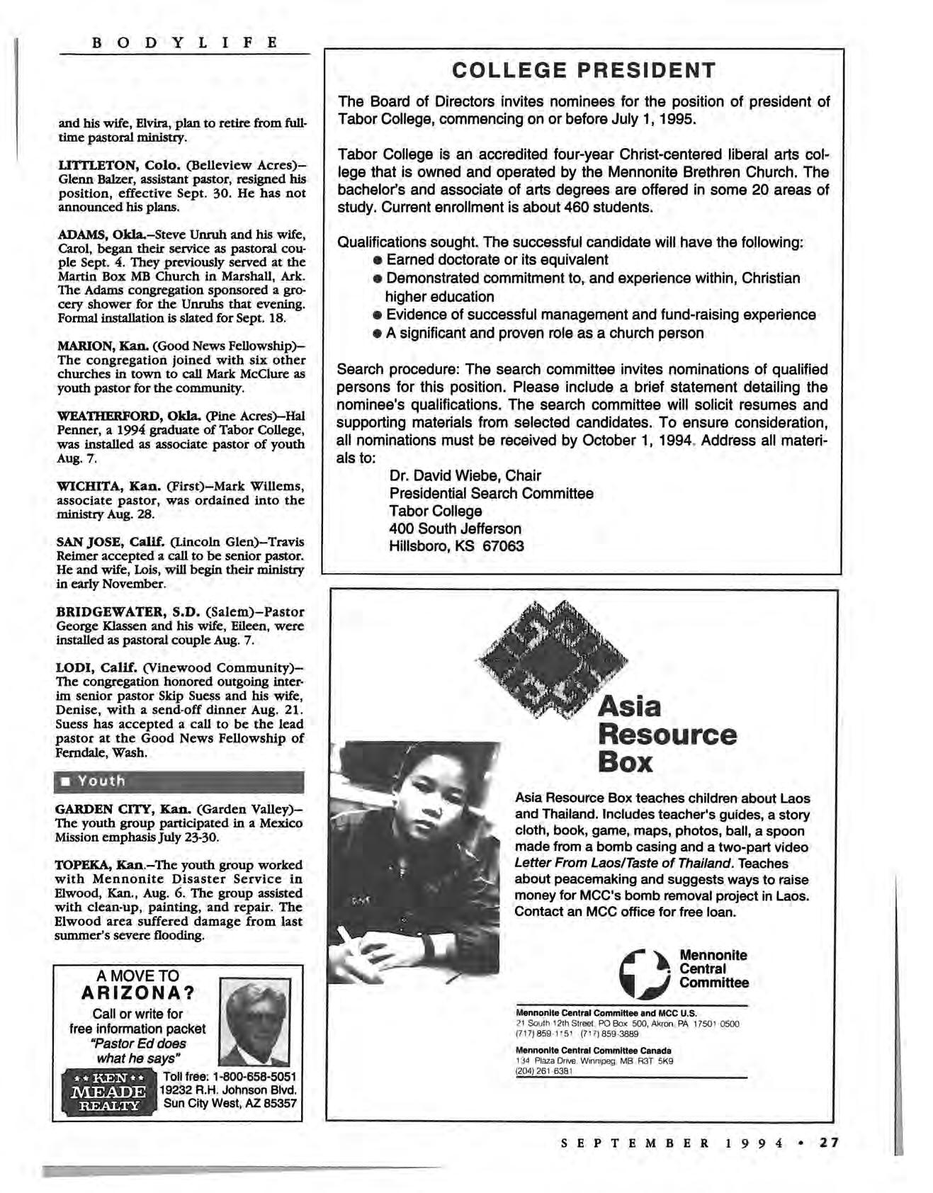The Board of Directors invites nominees for the position of president of Tabor College, commencing on or before July 1, 1995.
