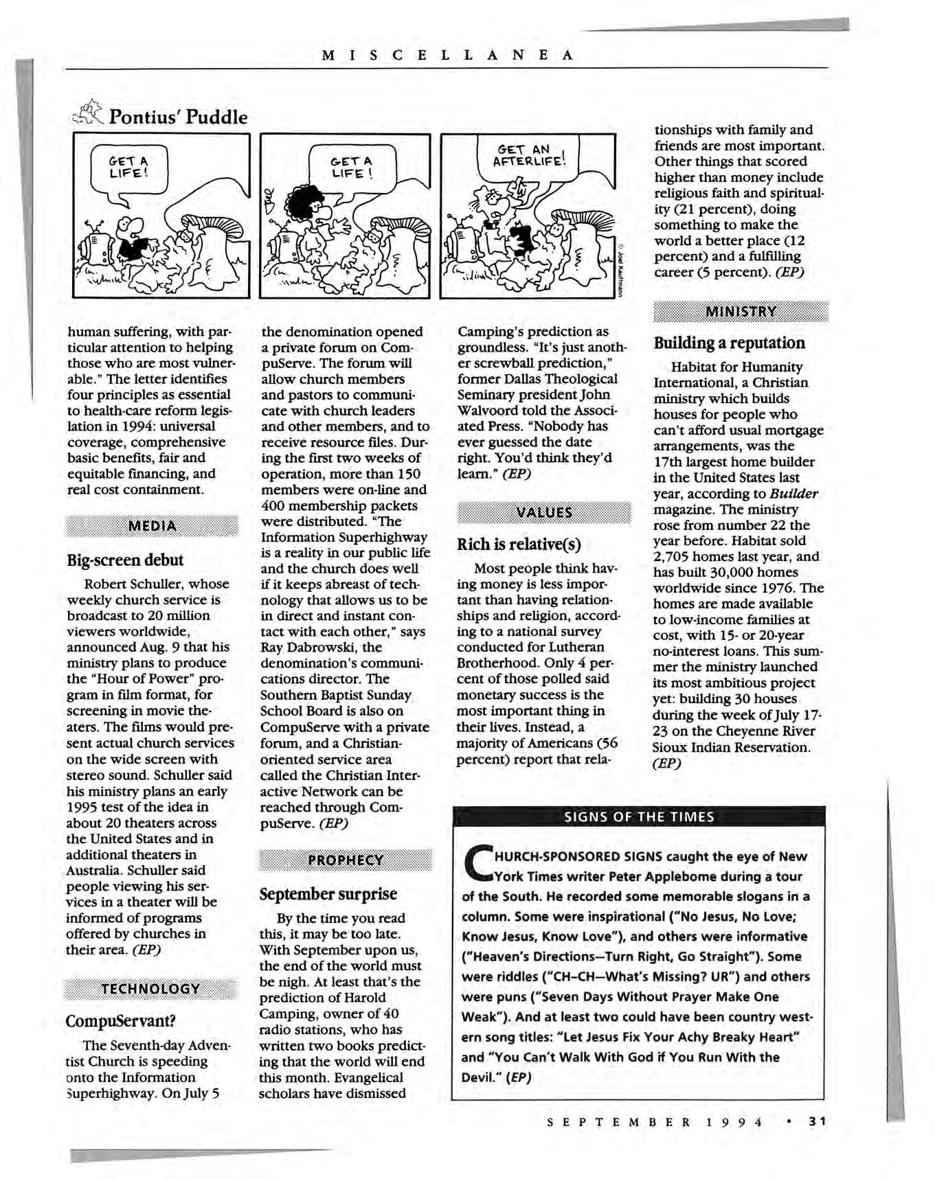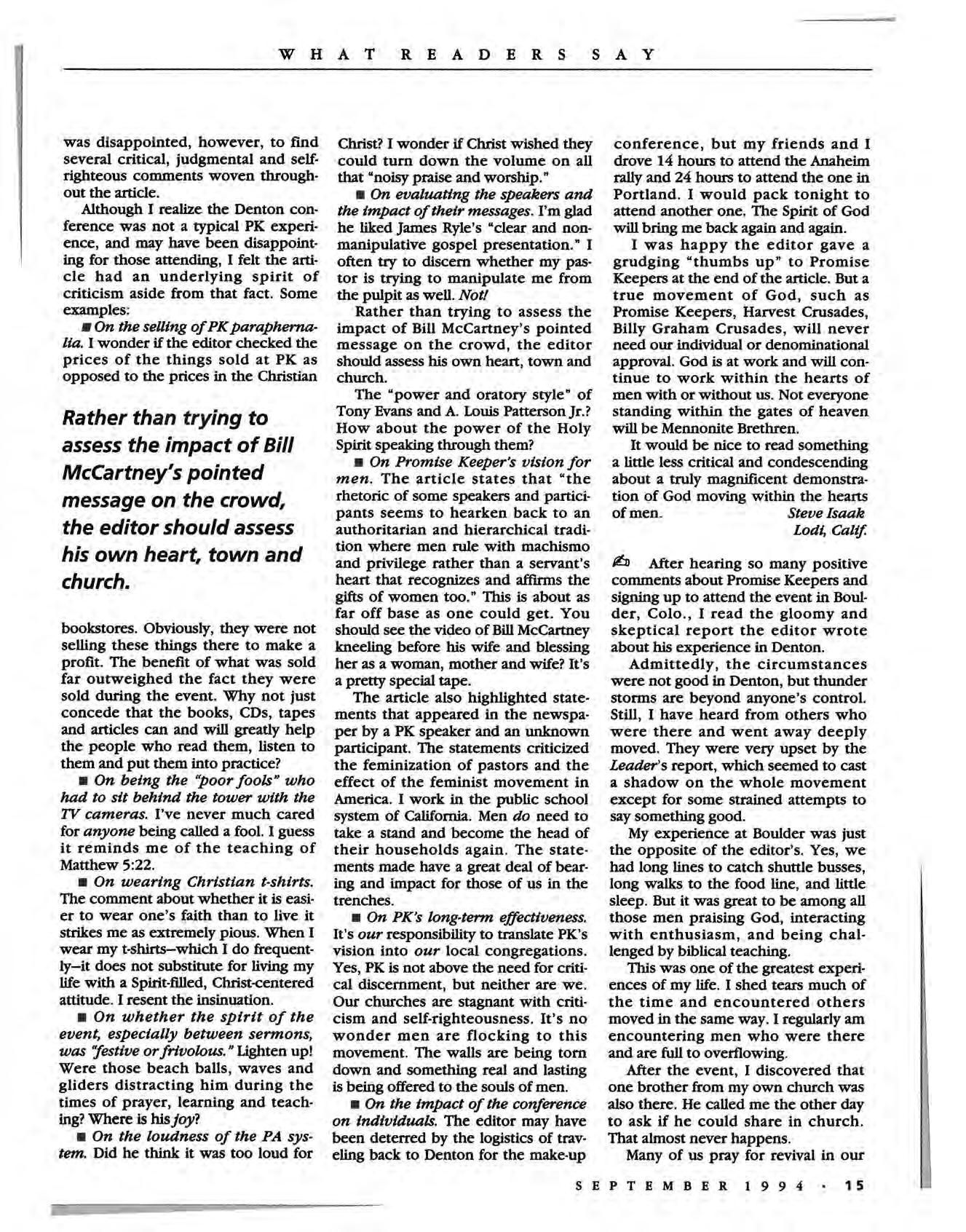 • In Los Angeles, an event aimed at Latinos that included Christian salsa musicians, rap artists, mimes, jugglers, a live 1V broadcast of a World Cup game and a sermon by Hugo Perez, drew 3,000 participants; 75 made decisions for Christ. (Pacific News Service, reported in Mennonite Weekry Review)