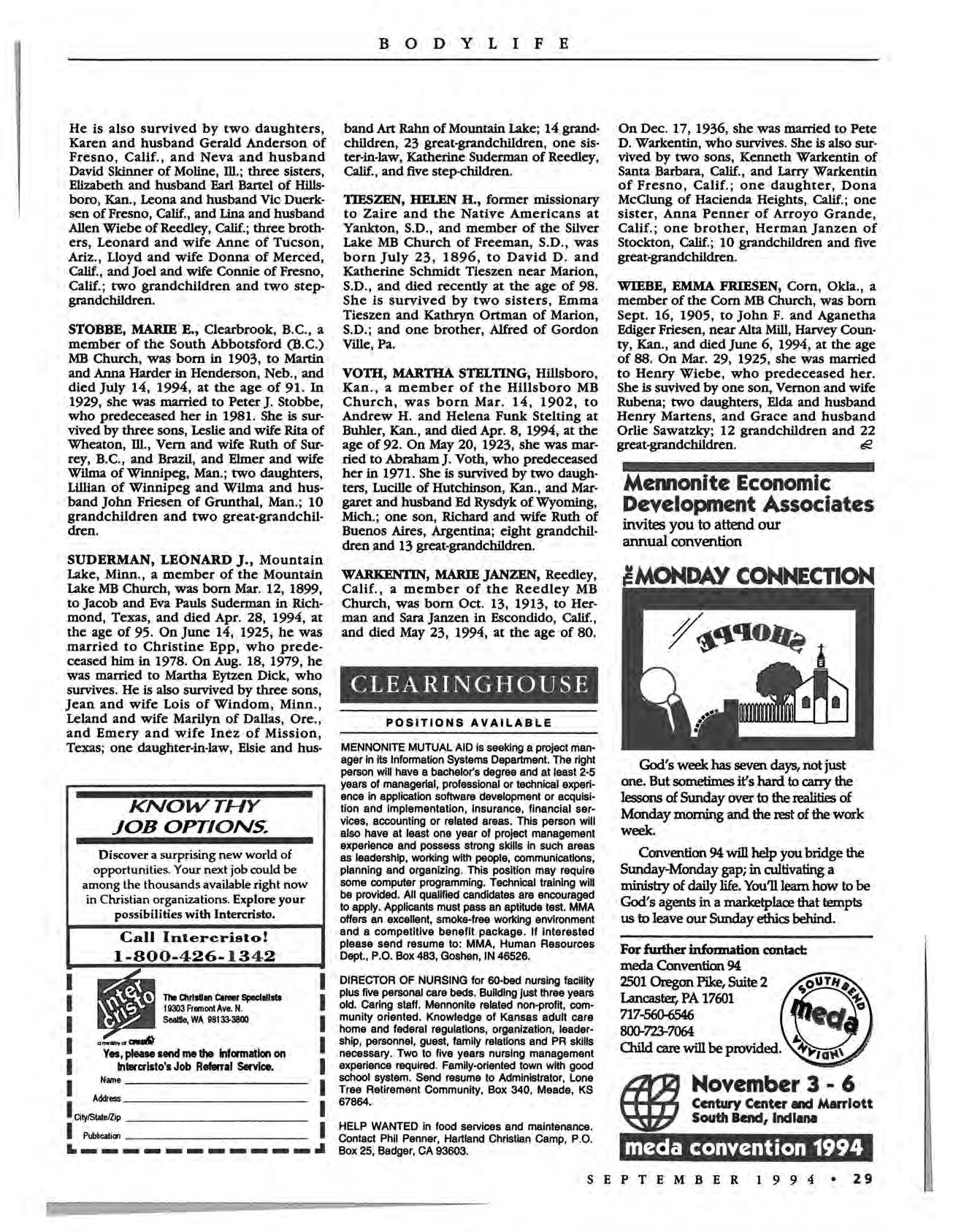 SUDERMAN, LEONARD J., Mountain Lake, Minn., a member of the Mountain Lake MB Church, was born Mar. 12, 1899, to Jacob and Eva Pauls Sudertnan in Rich· mond, Texas, and died Apr. 28, 1994, at the age of 95. On June 14, 1925, he was married to Christine Epp, who prede· ceased him in 1978. On Aug. 18, 1979, he was married to Martha Eytzen Dick, who survives He is also survived by three sons, Jean and wife Lois of Windom, Minn., Leland and wife Marilyn of Dallas, Ore., and Emery and wife Inez of Mission, Texas; one daughter·in·law, Elsie and hus-