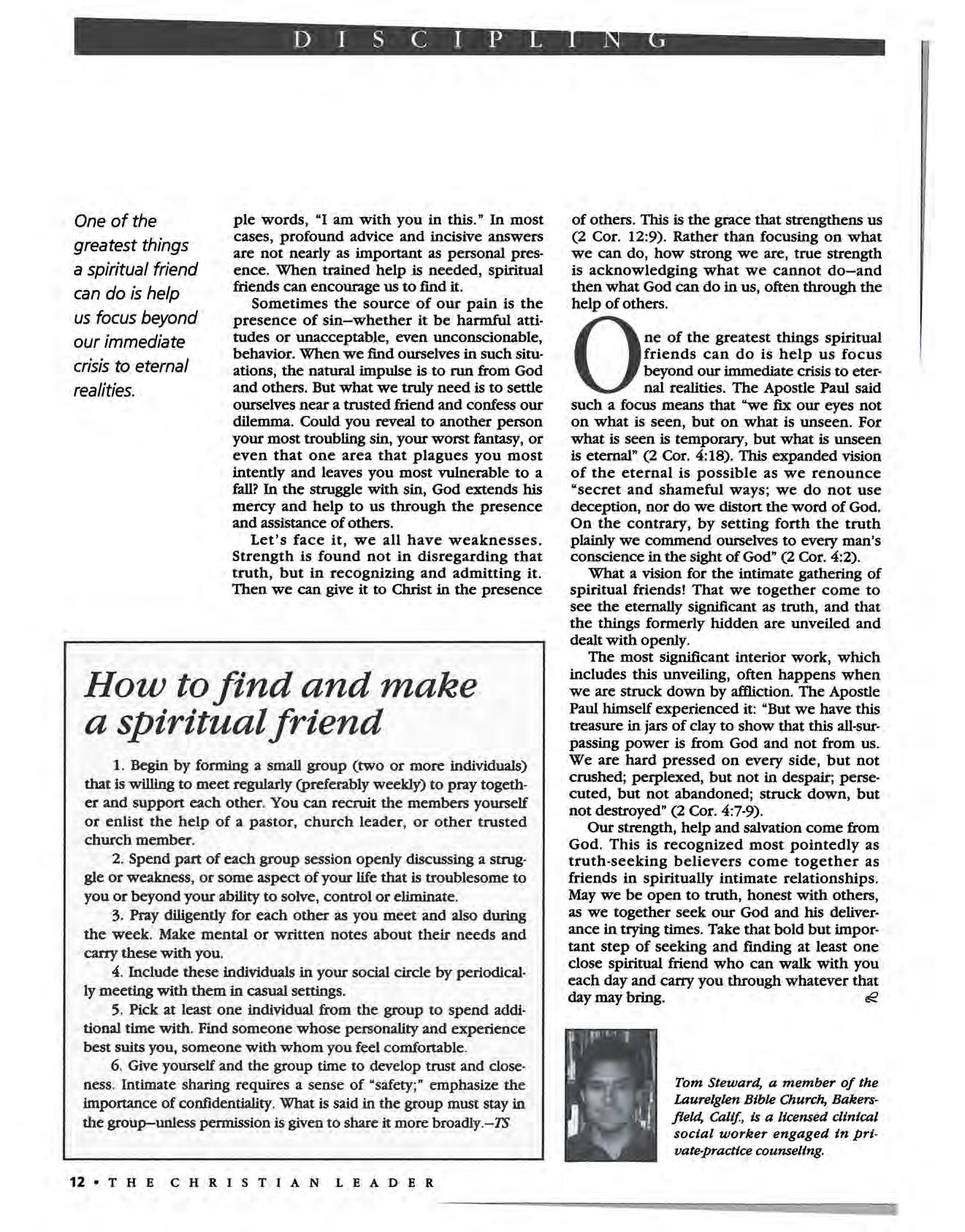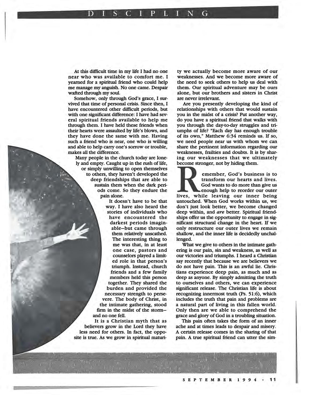 Finally, Tom Steward presents another side of discipling-developing committed relationships with friends believing friends. Simply put, followers of Christ need each other. Be challenged to open your life to another person this fall.-DR