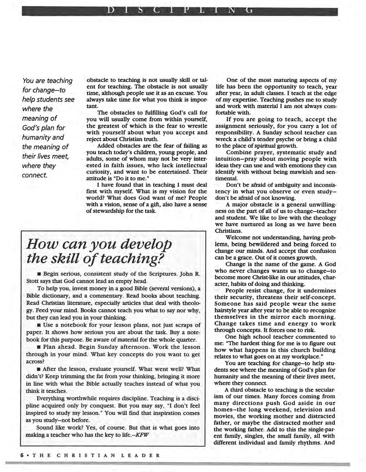 THEY MAY BE the unsung heroes of the church-the Sunday school and Bible study group leaders who toil week after week to bring God's Word to life in the lives of their fellow spiritual travelers. Too often, their commitment is taken for granted by those they lead.