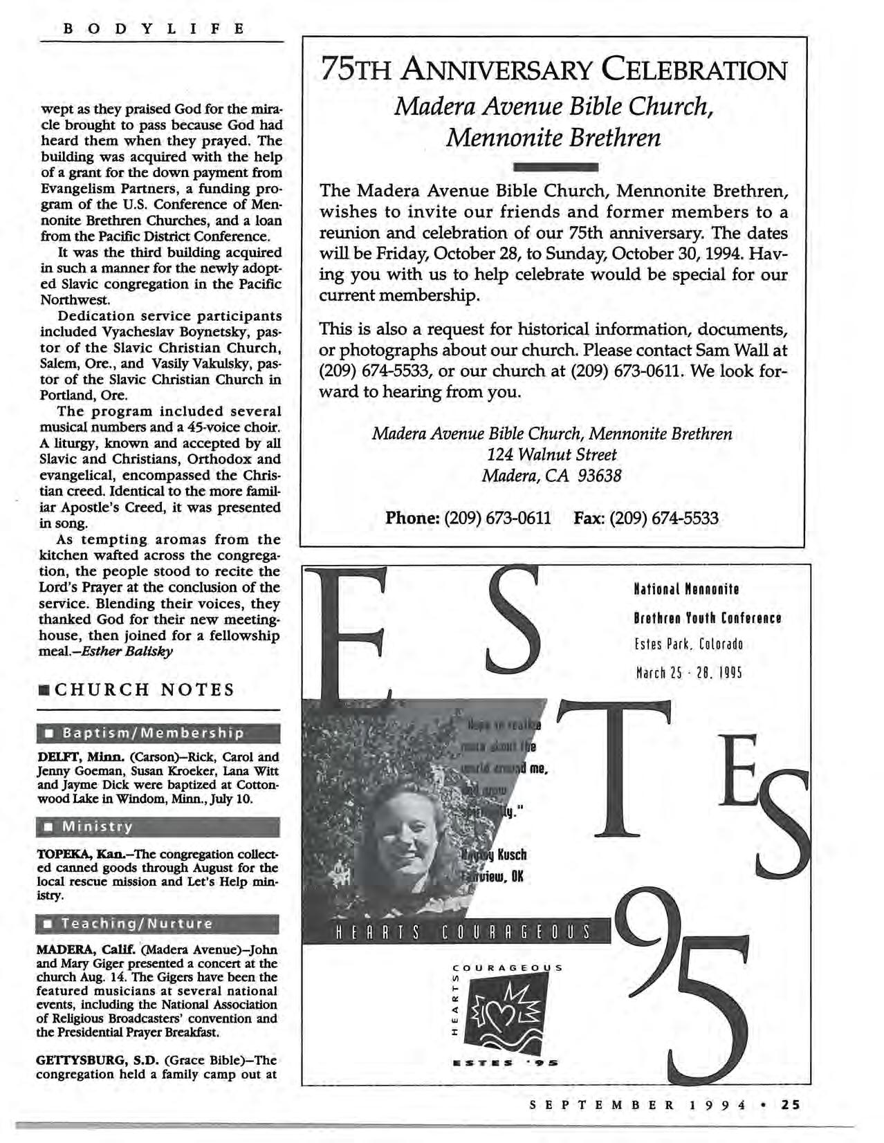 The Madera Avenue Bible Church, Mennonite Brethren, wishes to invite our friends and former members to a reunion and celebration of our 75th anniversary. The dates will be Friday, October 28, to Sunday, October 30,1994. Having you with us to help celebrate would be special for our current membership.