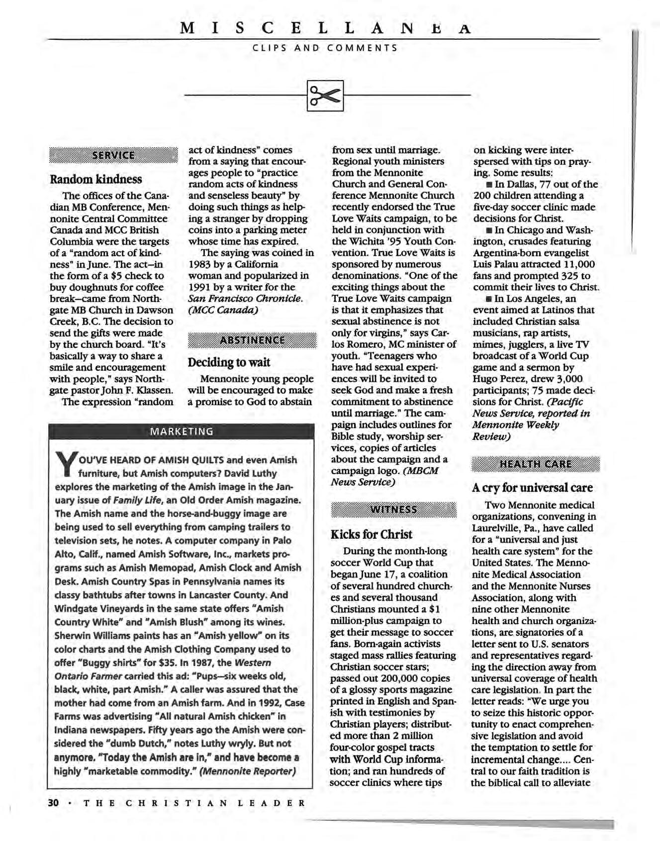 OU'VE HEARD OF AMISH QUILTS and even Amish furniture, but Amish computers? David Luthy explores the marketing of the Amish image in the January issue of Family Life, an Old Order Amish magazine_ The Amish name and the horse-and-buggy image are being used to sell everything from camping trailers to television sets, he notes_ A computer company in Palo Alto, Calif_, named Amish Software, Inc., markets programs such as Amish Memopad, Amish Clock and Amish Desk. Amish Country Spas in Pennsylvania names its classy bathtubs after towns in Lancaster County. And Windgate Vineyards in the same state offers "Amish Country White" and "Amish Blush" among its wines. Sherwin Williams paints has an "Amish yellow" on its color charts and the Amish Clothing Company used to offer "Buggy shirts" for $35. In 1987, the Westem Ontario Farmer carried this ad: "Pups-six weeks old, black, white, part Amish." A caller was assured that the mother had come from an Amish farm. And in 1992, Case Farms was advertising "All natural Amish chicken" in Indiana newspapers. Fifty years ago the Amish were considered the "dumb Dutch," notes Luthy wryly. But not anymore. "Today the Amish are In," and have become a highly "marketable commodity." (Mennonite Reporter)