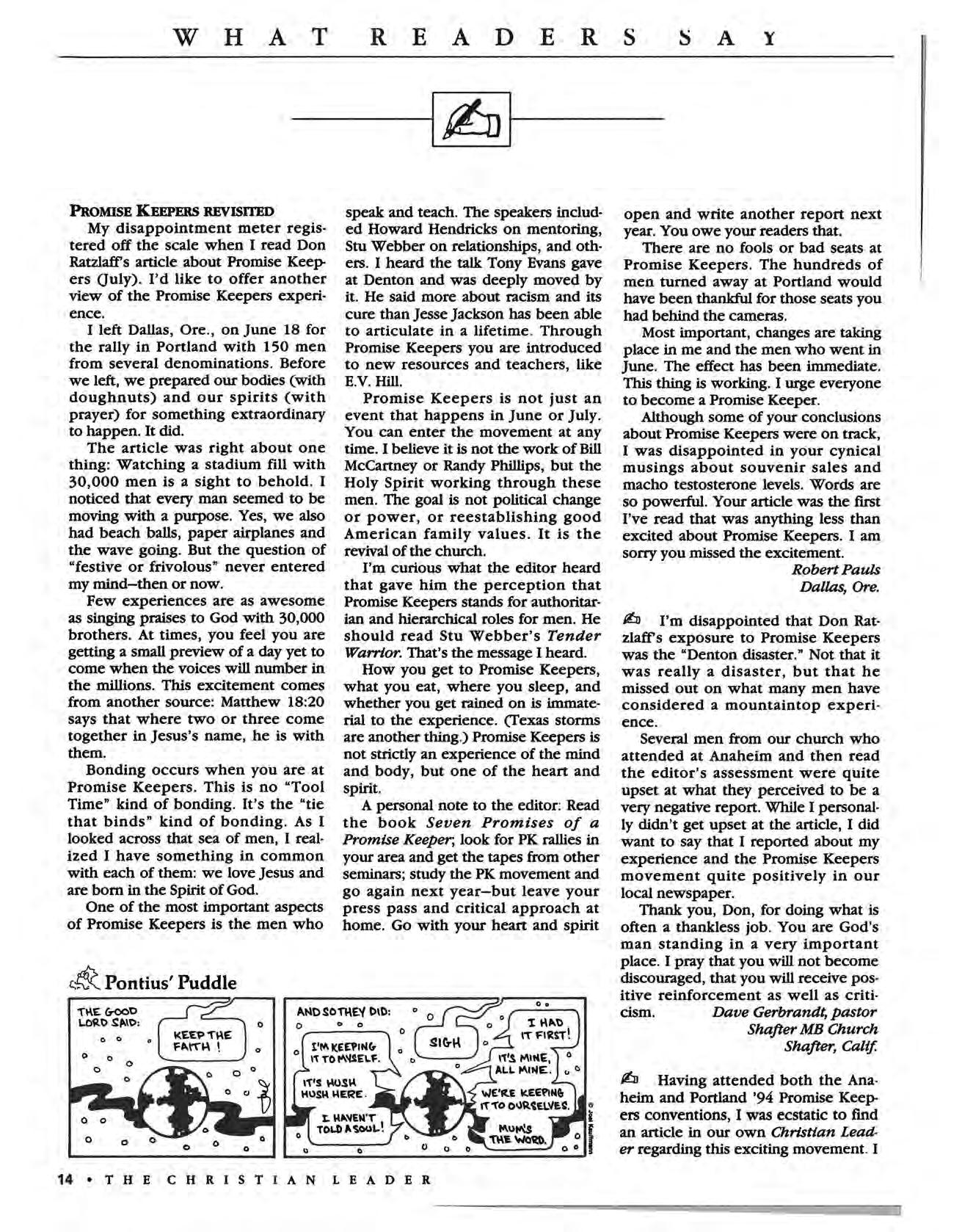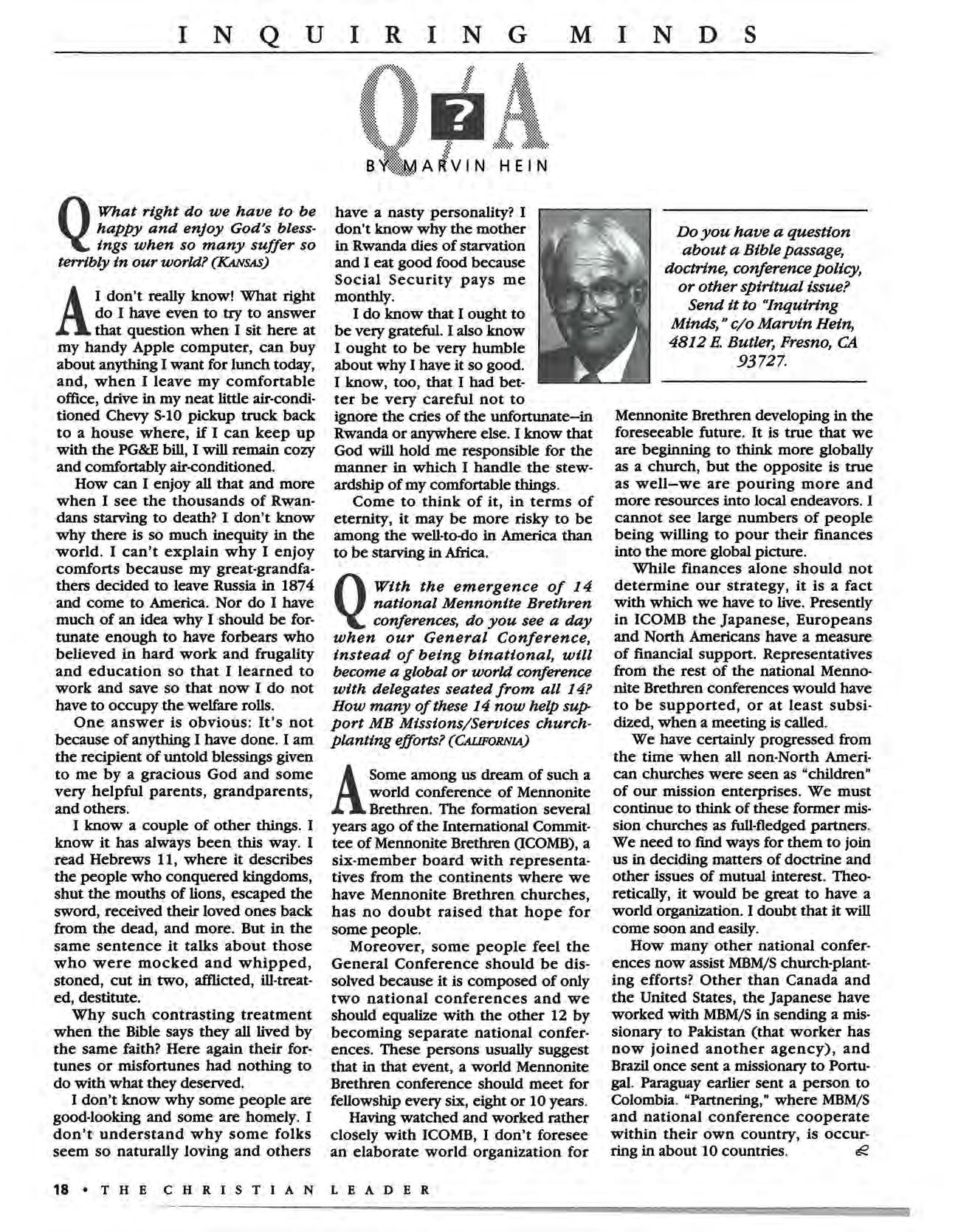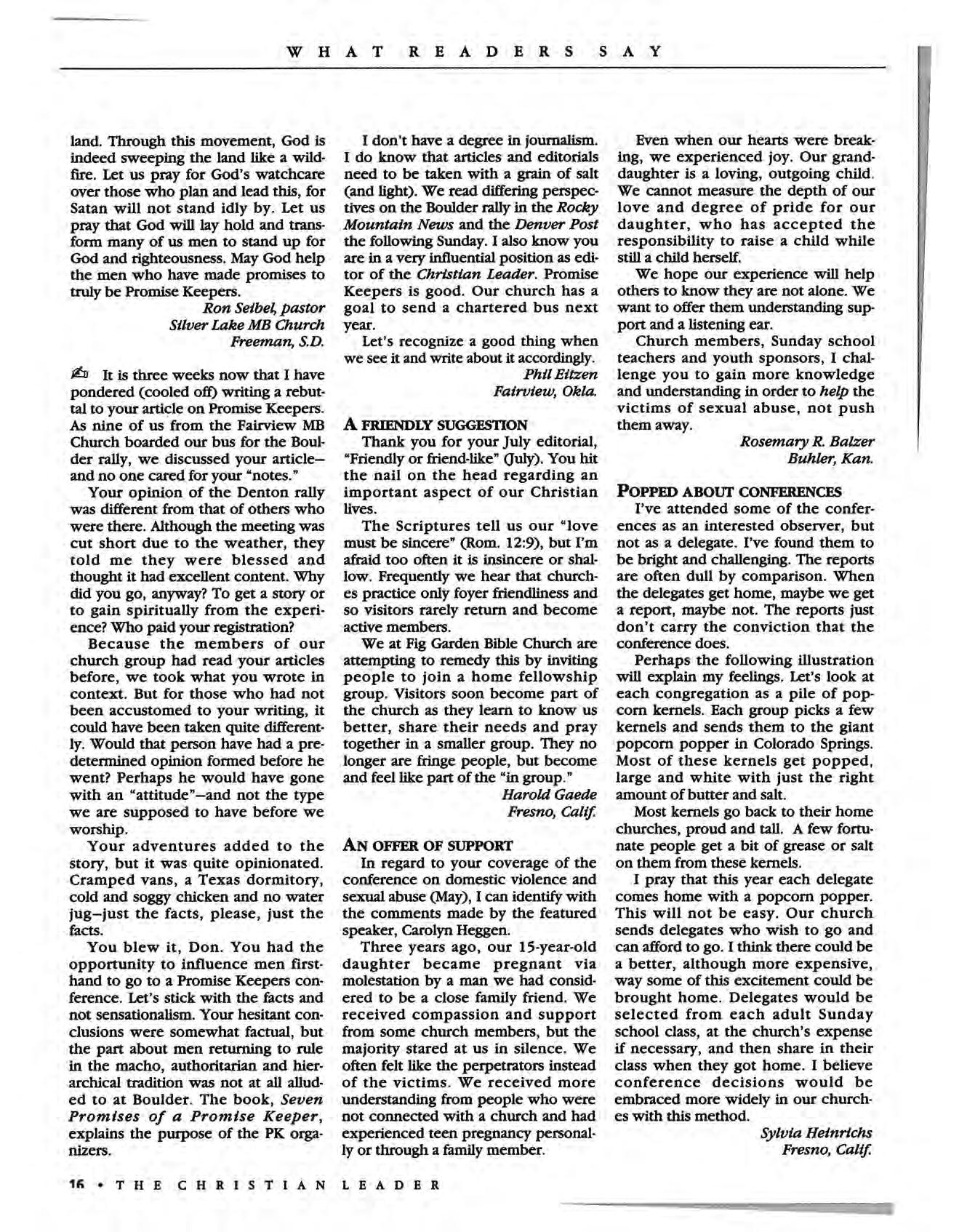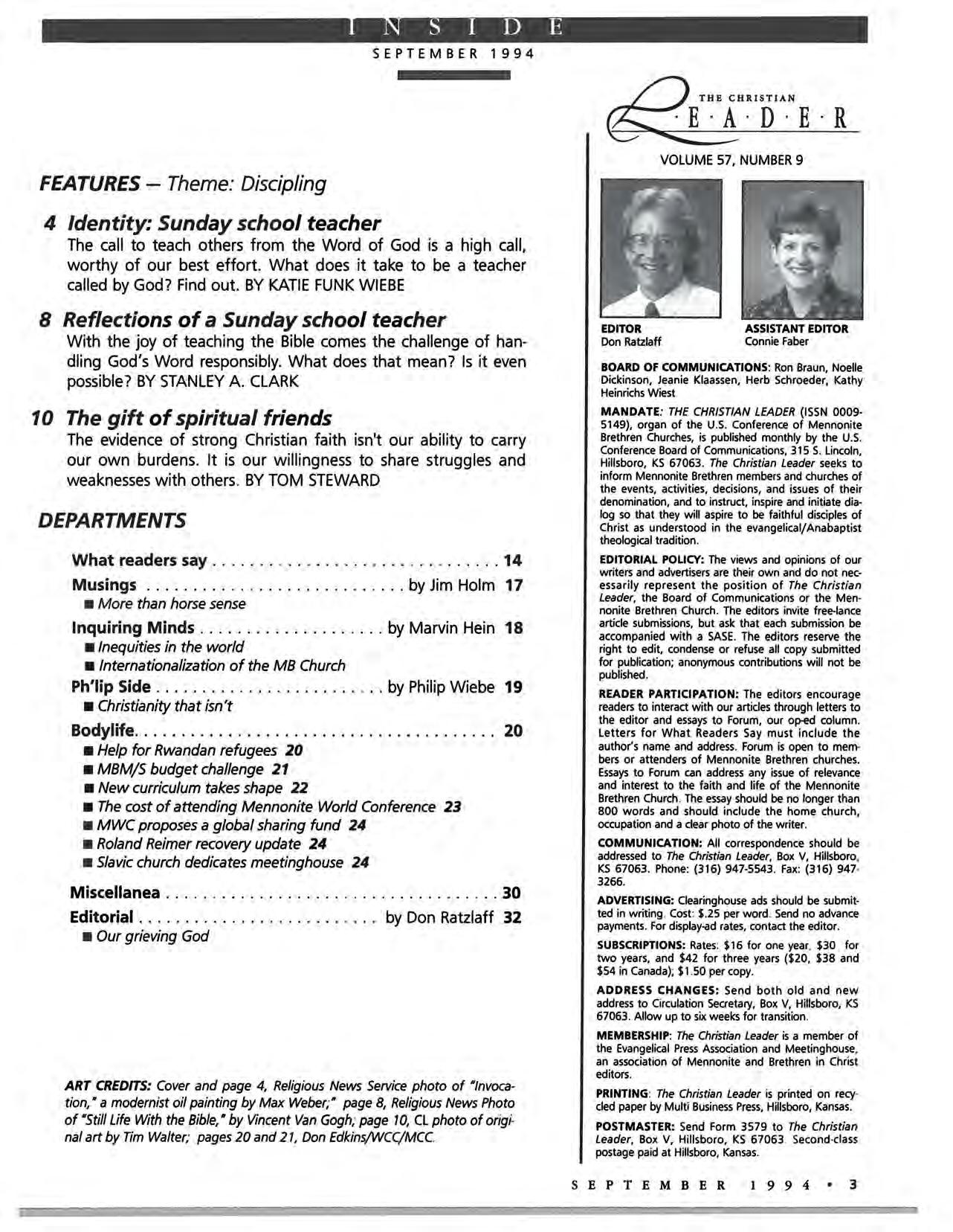 EDITORIAL POLICY: The views and opinions of our writers and advertisers are their own and do not necessarily represent the position of The Christian Leader, the Board of Communications or the Men· nonite Brethren Church. The editors invite free-lance article submissions, but ask that each submission be accompanied with a SASE The editors reserve the right to edit, condense or refuse all copy subm itted for publication; anonymous contributions will not be published