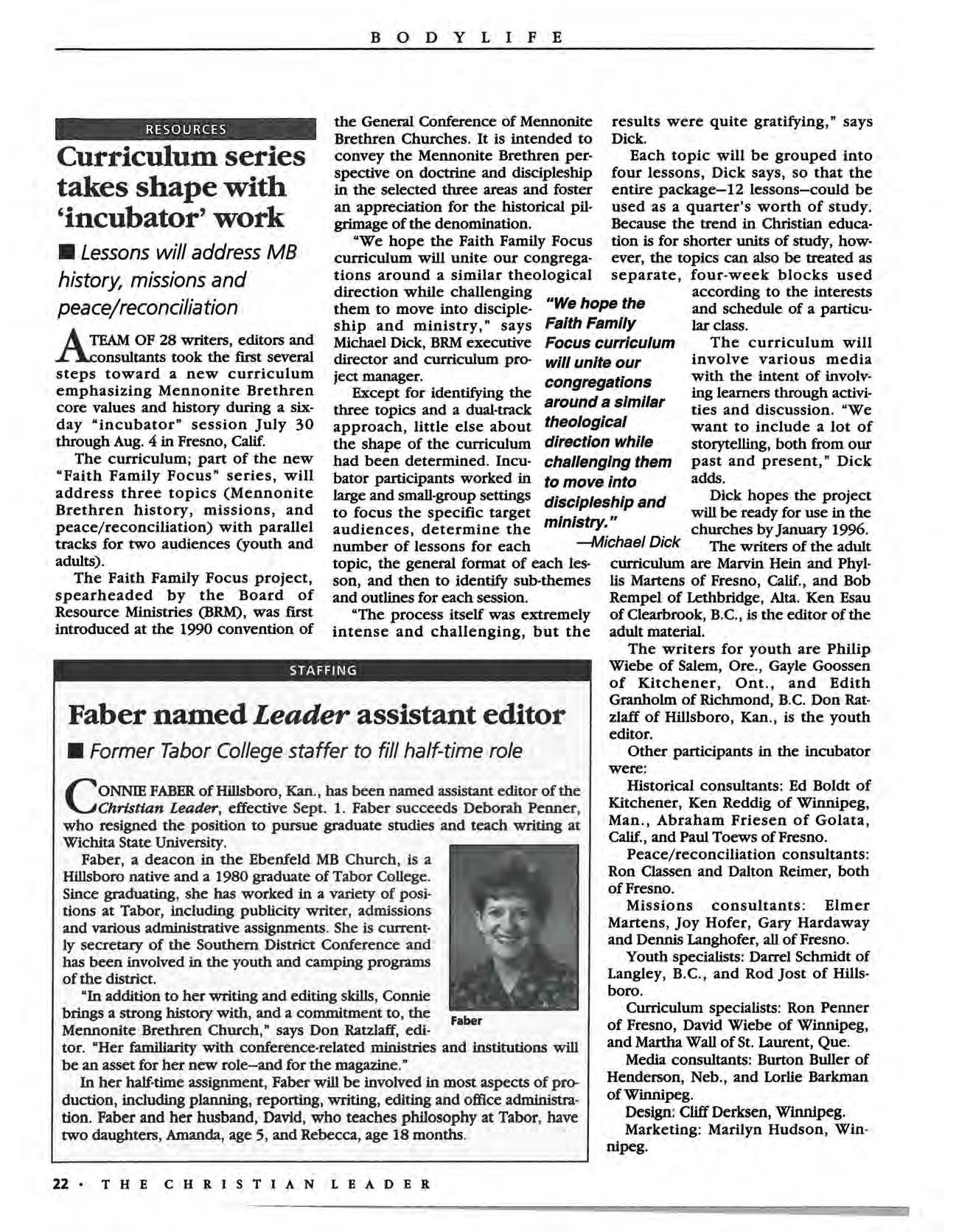 MANDATE: THE CHRISTIAN LEADER (ISSN 00095149), organ of the U.S. Conference of Mennonite Brethren Churches, is published monthly by the U.S. Conference Board of Communications, 315 S Lincoln, Hillsboro, KS 67063 The Christian Leader seeks to inform Mennonite Brethren members and churches of the events, activities, decisions, and issues of their denomination, and to instruct, inspire and initiate dialog so that they will aspire to be faithful disciples of Christ as understood in the evangelical!Anabaptist theological tradition.