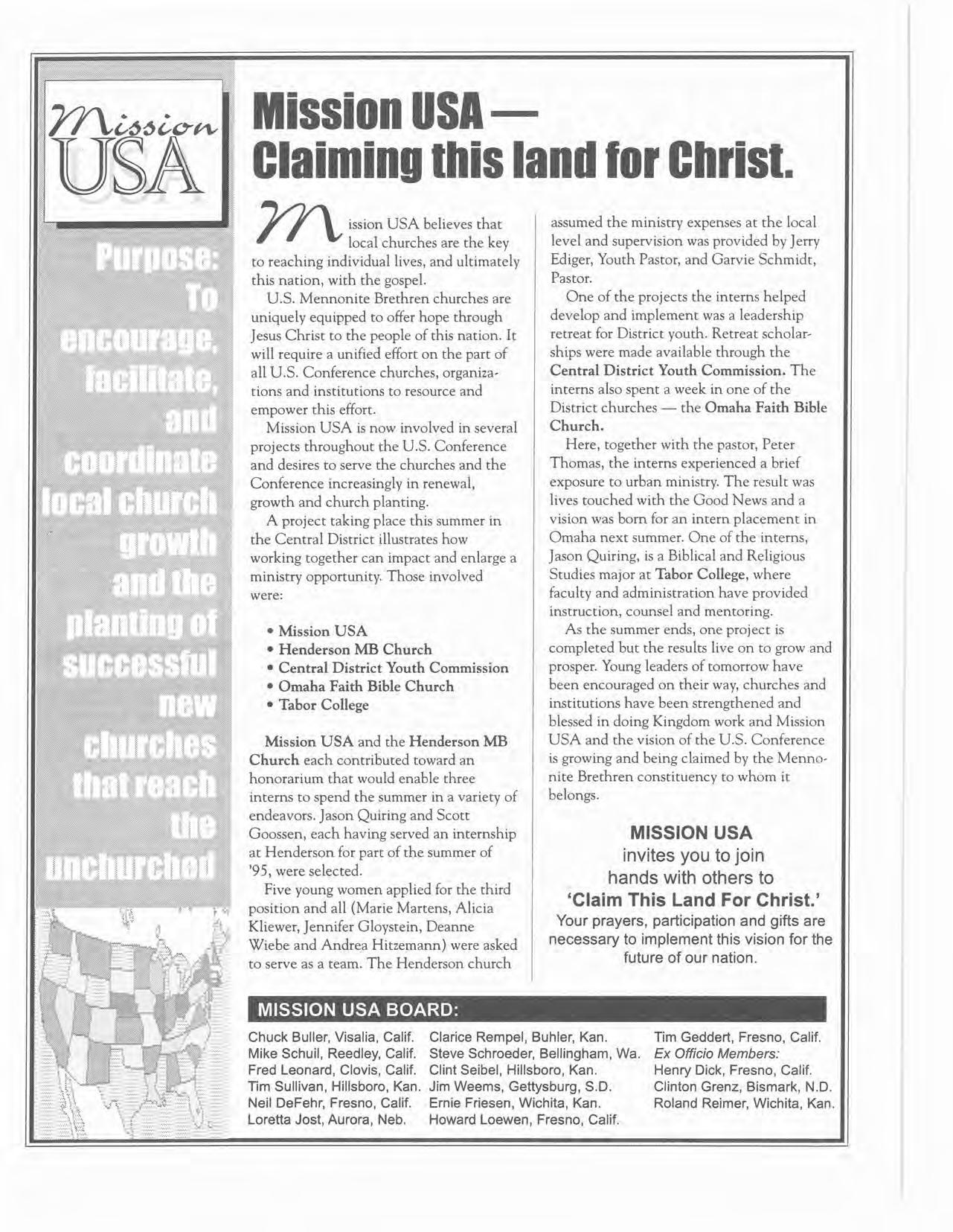 But the skepticism is there. Some will point to the many emotional-and mostly unsuccessful-evangelism forays our conference has blessed in the past. Others note that Mission USA has been primarily a leadershipdriven movement, that the grass roots is only marginally interested in denominational ventures. A few wish Mennonite Brethren would get beyond their fetish with church growth and take on a broader agenda of churchly concerns.