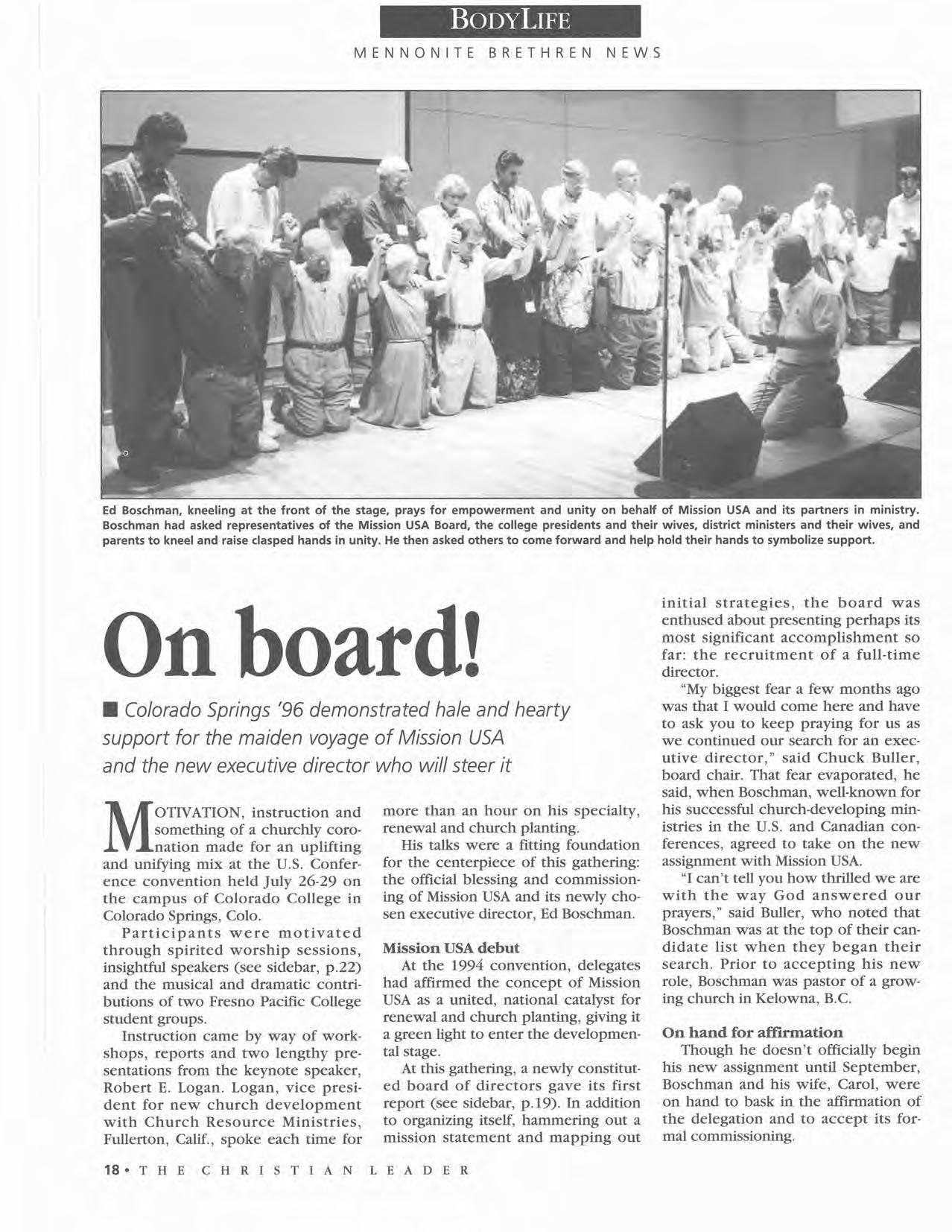 THE ATMOSPHERE in Colorado College's Packard Hall was rarified and unified. It was the last session of Colorado Springs '96, the national convention of the u.S. Conference. Symbolically, practically, and universally, delegates had affirmed Mission USA as the new renewal and church-planting thrust of the U.S. Conference. They had officially and joyously commissioned an executive director and his wife to lead it.