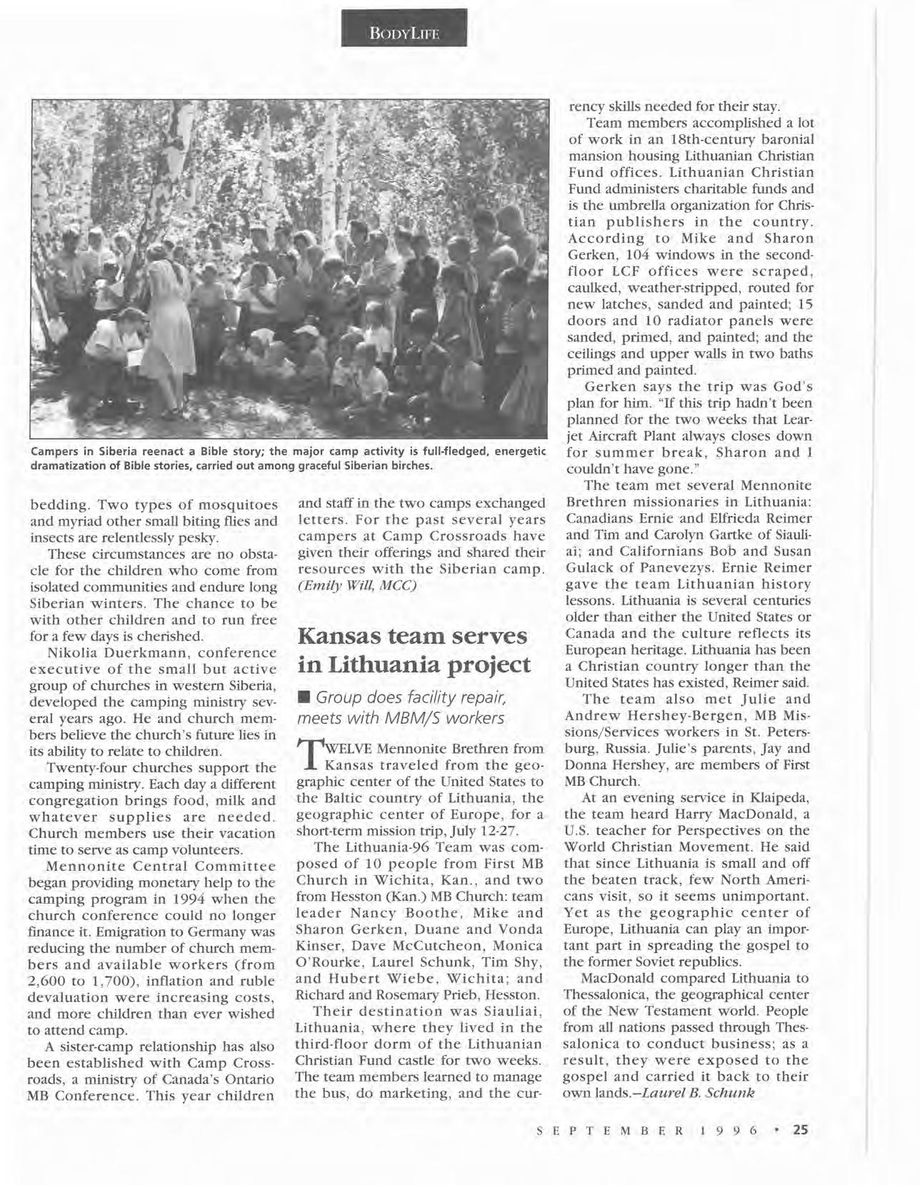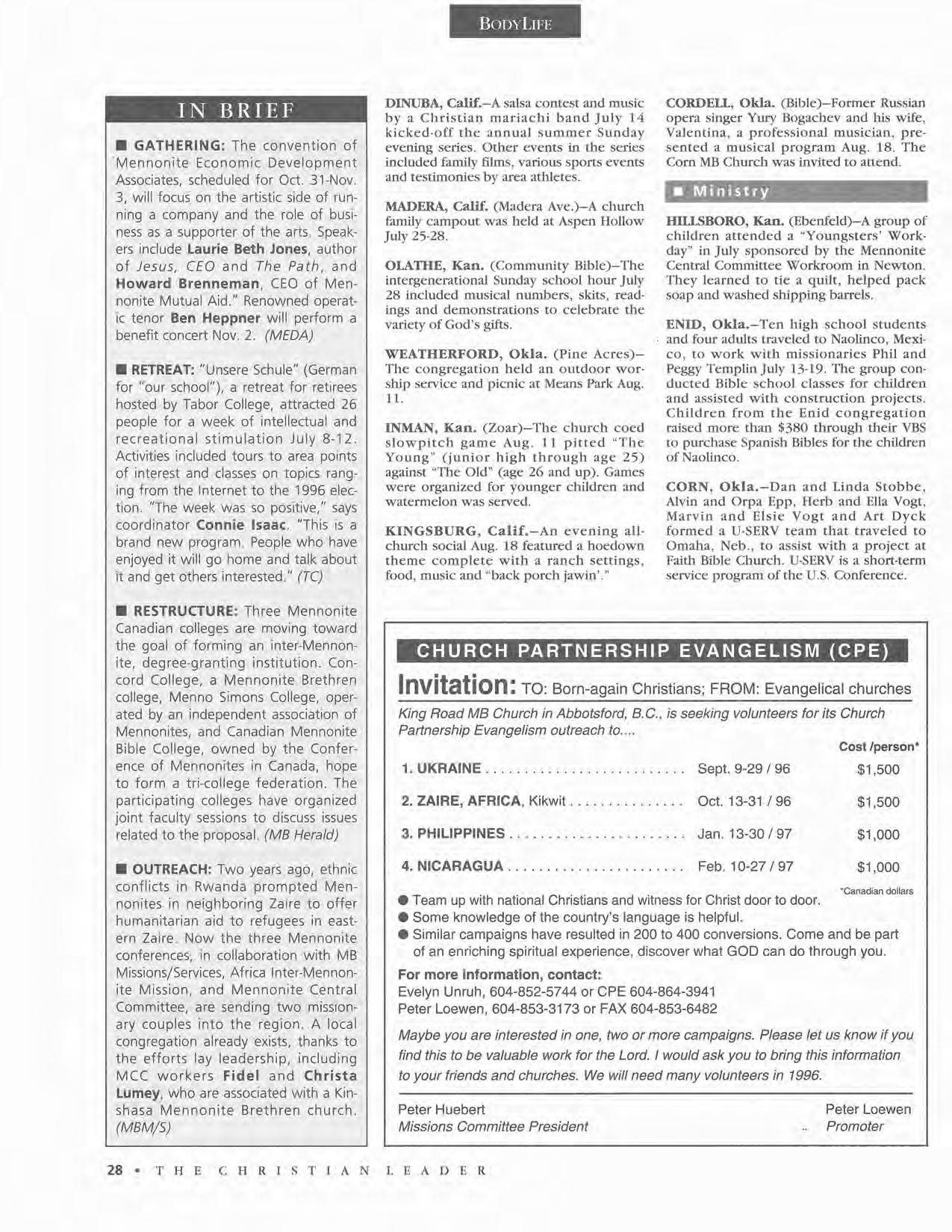 EDITORIAL POLICY: The views and opinions of our writers and advertisers are their own and do not necessarily represent the position of The Christian Leader, the Board of Communications or the Mennonite Brethren Church. The editors invite free-lance article submissions, but ask that each submission be accompanied with a SASE. The editors reserve the right to edit, condense or refuse all copy submitted for publication; anonymous contributions will not be published.