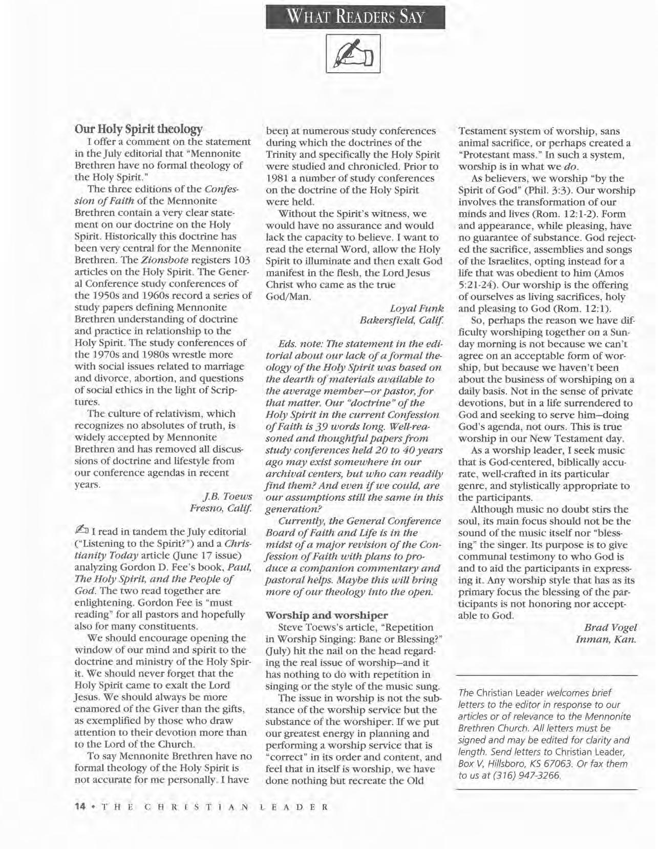READER PARTICIPATION: The editors encourage readers to interact with our articles through letters to the editor and essays to Forum, our op-ed column. Letters for What Readers Say must include the author's name and address. Forum is open to members or attenders of Mennonite Brethren churches. Essays to Forum can address any issue of relevance and interest to the faith and life of the Mennonite Brethren Church. The essay should be no longer than 800 words and should include the home church, occupation and a clear photo of the writer.