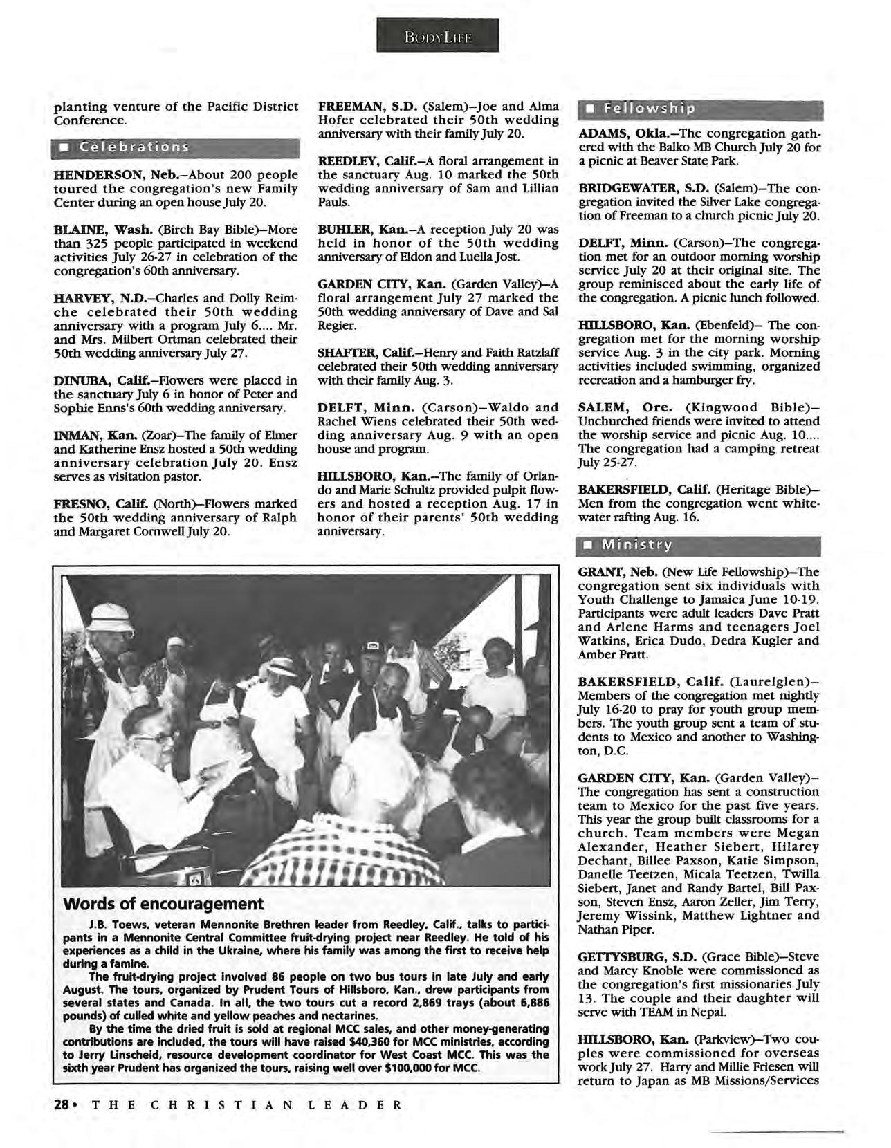 EDITORIAL POLICY: The views and opinions of our writers and advertisers are their own and do not necessarily represent the position of the Christian Leader, the Board of Communications or the Mennonite Brethren Church The editors invite free-lance article submiss ions, but ask that each submission be accompanied with a SASE The editors reserve the right to edit, condense or refuse all copy submitted for publication; anonymous contributions will not be published