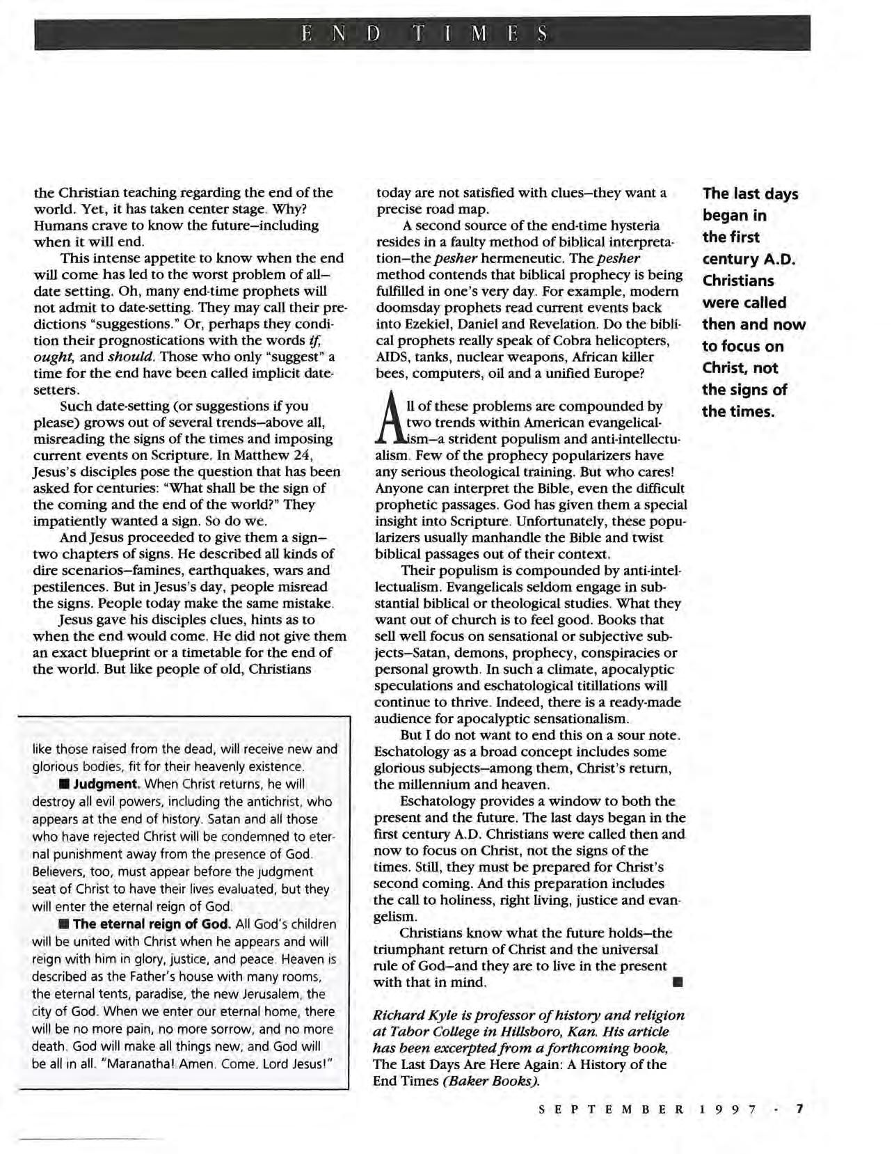 Richard Kyle is professor of history and religion at Tabor College in Hillsboro, Kan. His article has been excerpted from a forthcoming book, The Last Days Are Here Again: A History of the End Times (Baker Books).