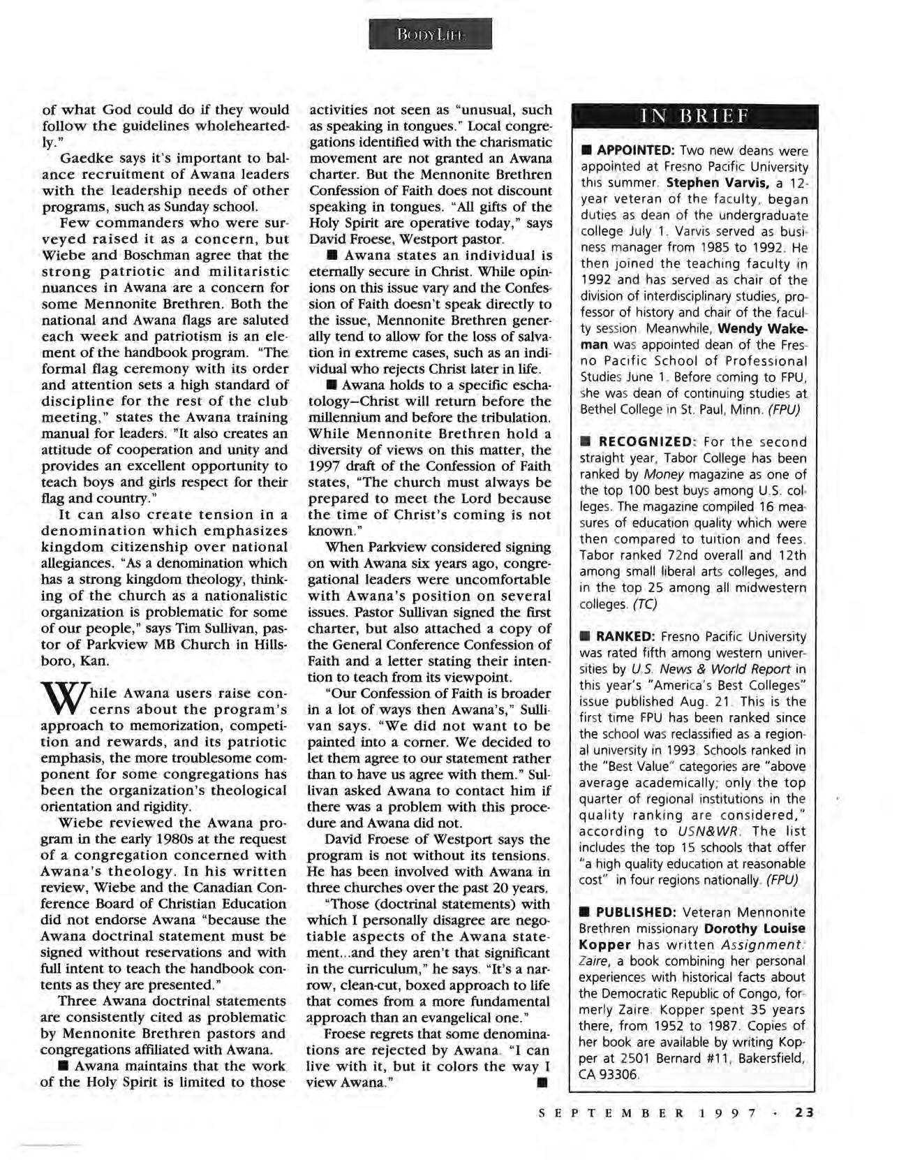 In our Bodylife section, assistant editor Connie Faber surveyed Mennonite Brethren congregations using the popular Awana club program for kids (page 20). The results indicate a mix of satisfaction and concern. Our intent is to identify both elements.