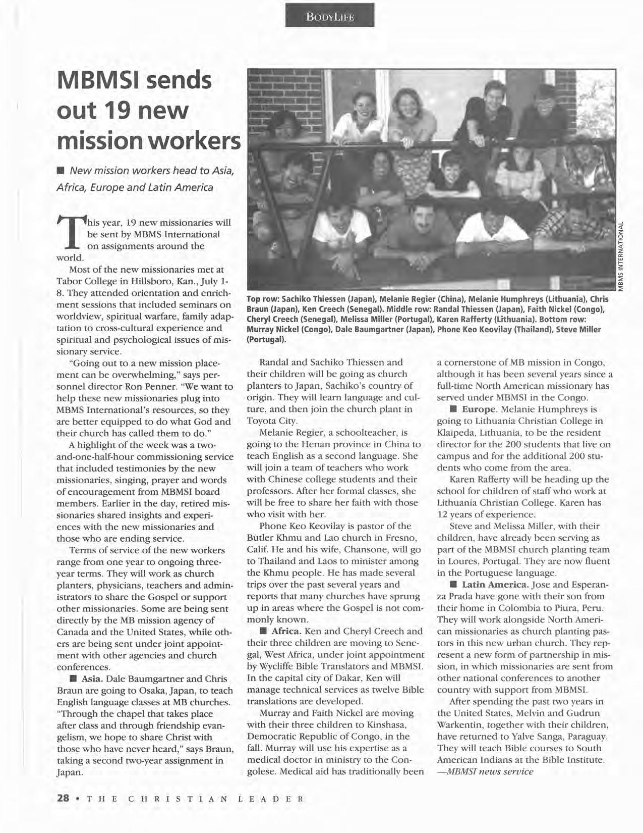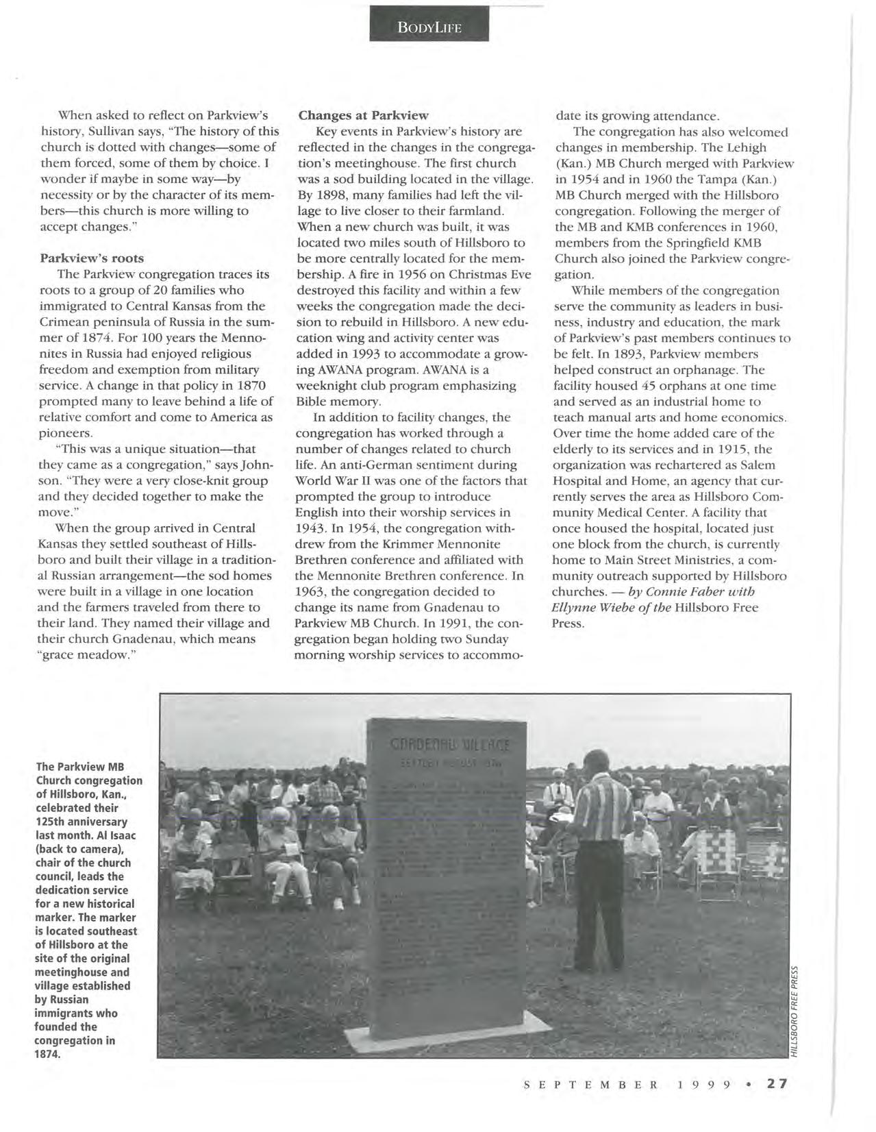 This month, BodyLife examines both changes and celebrations in our community. Connie Faber, associate editor, sat down with Larry Nikkel to talk about his recent installation as the new president of Tabor College, one of our Mennonite Brethren colleges. In another news feature, we look at Parkview MB Church, which is celebrating 125 years of history-and the changes that came along with those years. We also have news from our mission agencies. MBMS International (our global mission agency) is sending out 19 new mission workers abroad, while Mission USA (our church planting and renewal agency) is planting more churches in the United States. God bless. -CA