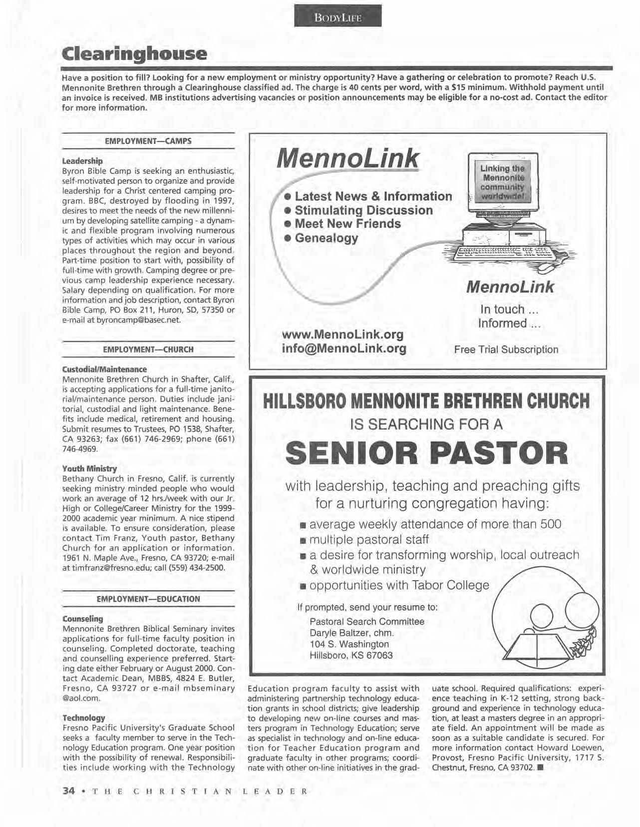 Have a position to fill? Looking for a new employment or ministry opportunity? Have a gathering or celebration to promote? Reach u.s. Mennonite Brethren through a Clearinghouse classified ad. The charge is 40 cents per word, with a $15 minimum. Withhold payment until an invoice is received. MB institutions advertising vacancies or position announcements may be eligible for a no-cost ad. Contact the editor for more information.