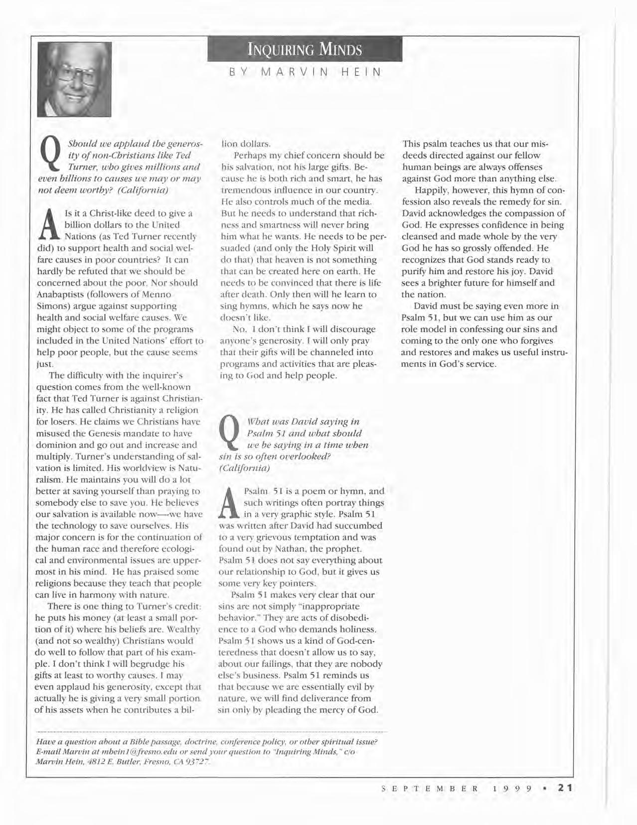 Mennonite Brethren Biblical Seminary invites applications for full-time faculty position in counseling. Completed doctorate, teaching and counselling experience preferred. Starting date either February or August 2000. Contact Academic Dean, MBBS, 4824 E. Butler, Fresno, CA 93727 or e-mail mbseminary @aol.com.