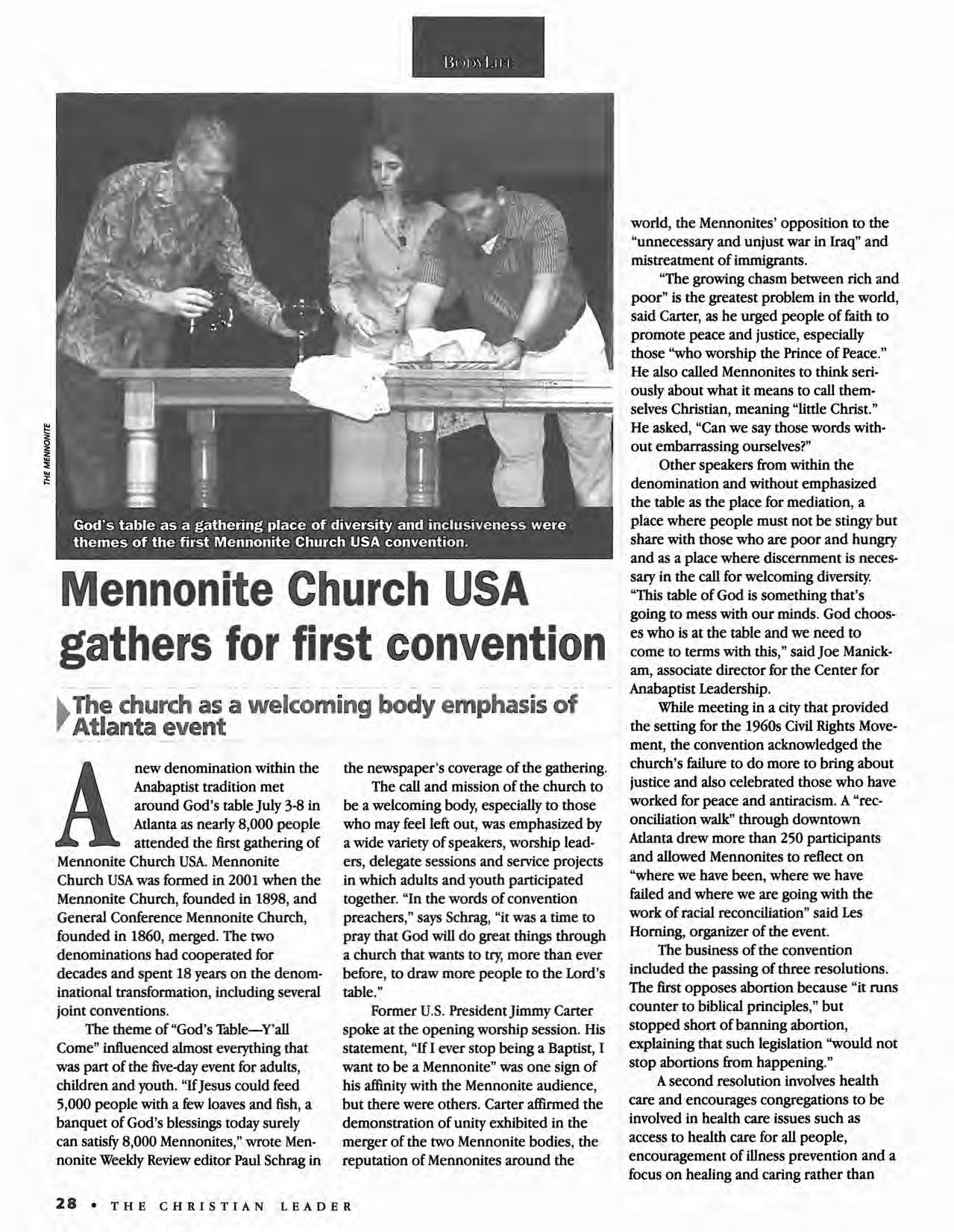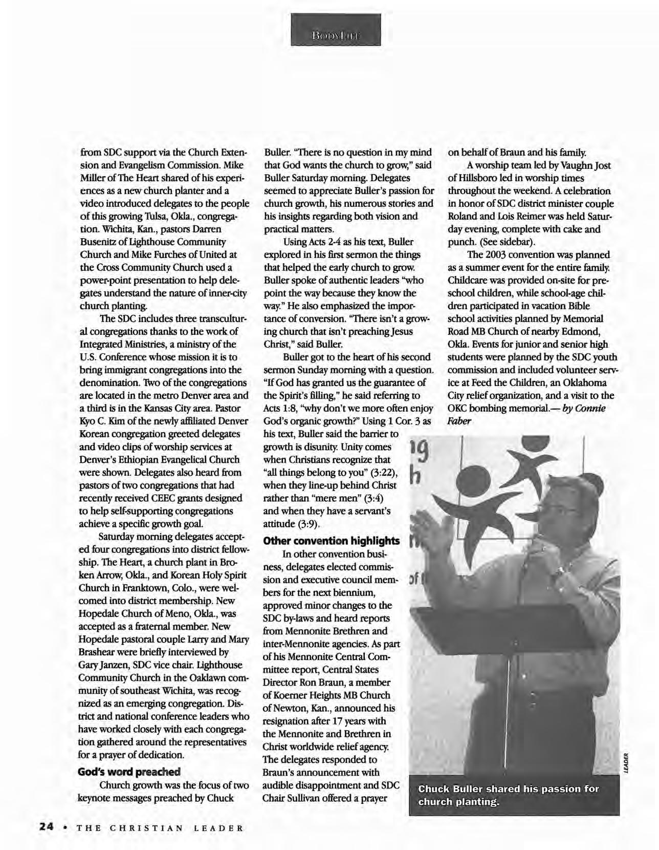 MANDATE: The Christian Leader (ISSN 0009-S149) is published monthly by the U.s. Conference of Mennonite Brethren Churches. The Christian Leader seeks to inform Mennonite Brethren members and churches of the events, activities, decisions and issues of their denomination, and to instruct, inspire and initiate dialogue so members will aspire to be faithful disciples of Christ as understood in the evangelical/Anabaptist theological tradition.
