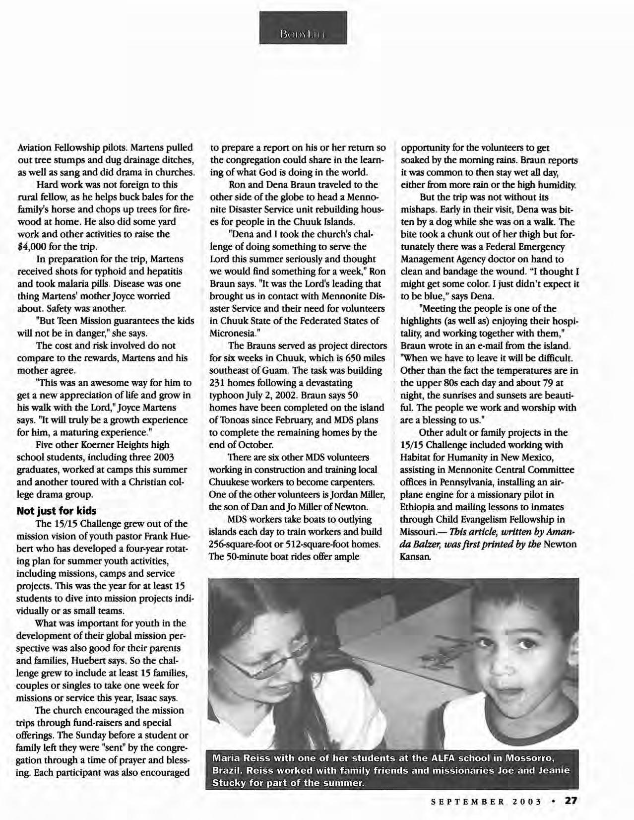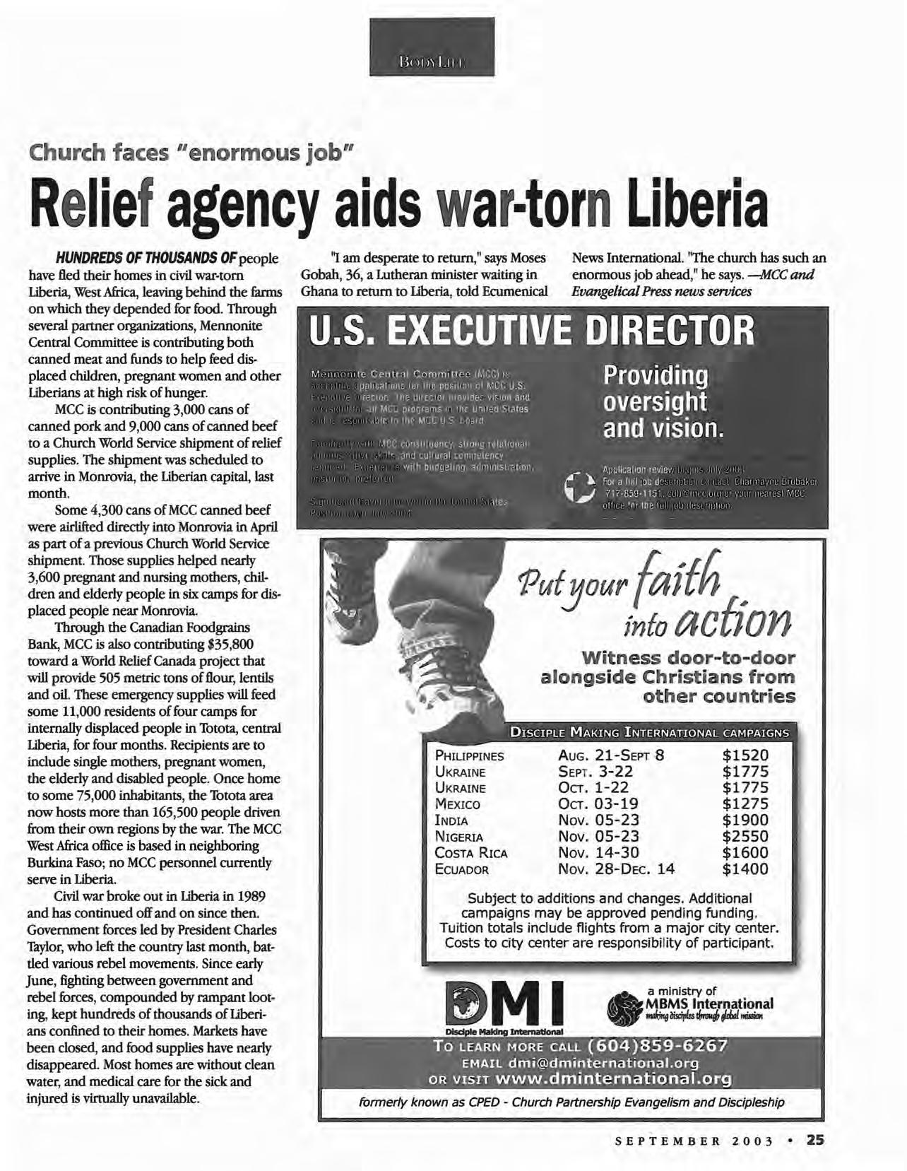 We are called to pray for our brothers and sisters around the globe. This month's news section can be used as a prayer guide. The needs and ministries of people living in two African .nations-the Democratic Republic of the Congo and Liberia-as well as in the Ukraine, Vietnam and Afghanistan are highlighted. These stories call us to remember that the Christian life for many is lived in adversity, not prosperity as in North America-and can always be lived generously, hopefully and joyfully. The story of a Newton, Kan., congregation's efforts to enhance its understanding of service and reports on the 2003 Southern District Conference convention and the gathering of a sister denomination, Mennonite Church USA, can prompt us to pray for our ministries here in the U.S. May our witness multiply as we pray for one another. -CF