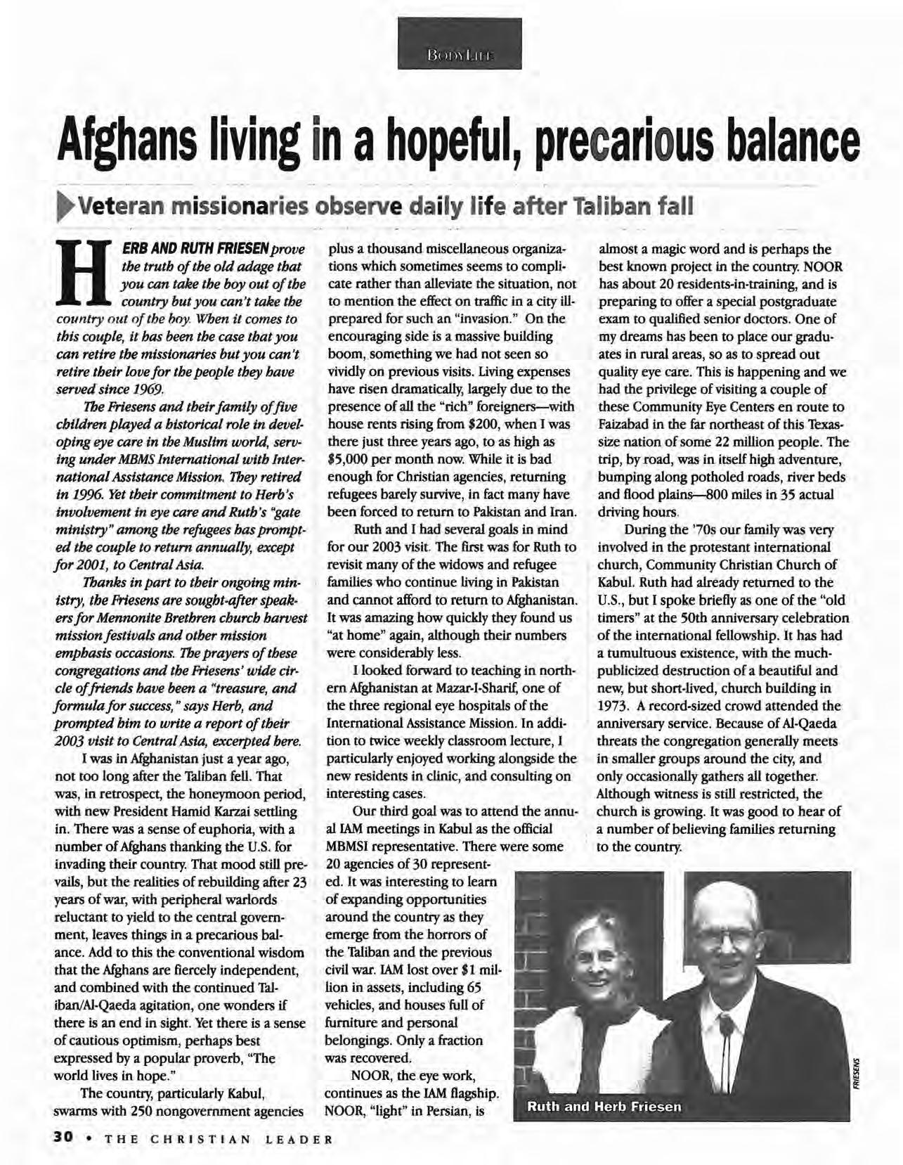 EDITORIAL POUCY: The views expressed in this publication do not necessarily represent the position of the Christian Leader, the Board of Communications or the Mennonite Brethren Church. Scripture references are from New International Version unless otherwise noted. The editors invite free-lance article submissions. A SASE must accompany articles.