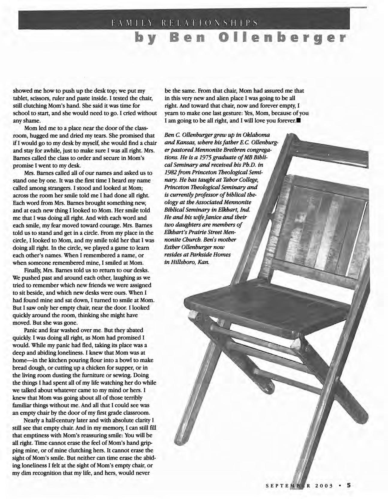 Ben C. Ollenburger grew up in Oklahoma and Kansas, where his father E. C. Ollenburger pastored Mennonite Brethren congregations. He is a 1975 graduate ofME Biblical Seminary and received his Ph.D. in 1982 from Princeton Theological Seminary. He has taught at Tabor College, Princeton Theological Seminary and is currently professor of biblical theology at the Associated Mennonite Biblical Seminary in Elkhart, Ind. He and his wifejanice and their two daughters are members of Elkhart's Prairie Street Mennonite Church. Ben's mother Esther Ollenburger now resides at Parkside Homes in Hillsboro, Kan.