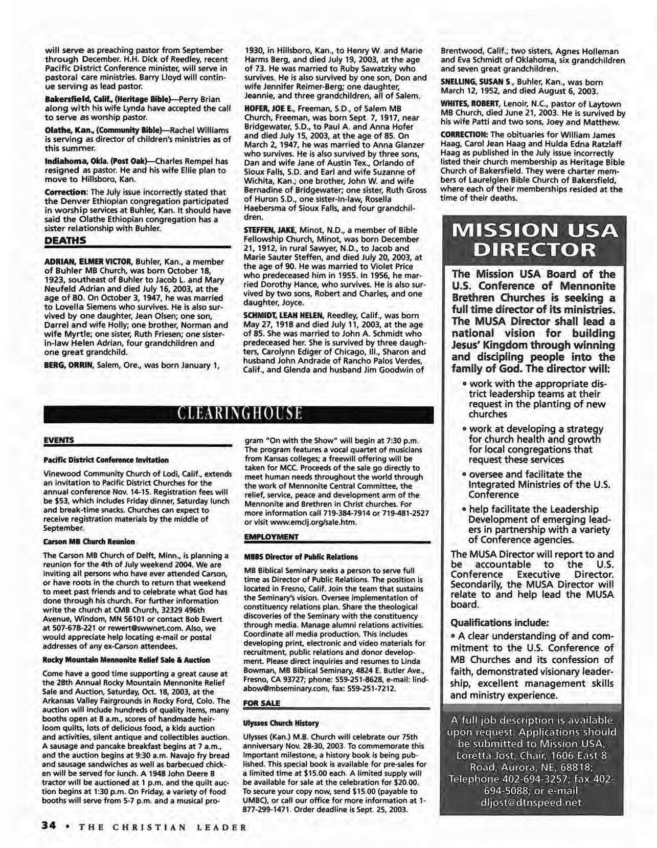 COMMUNICATION: All correspondence, including change of address, should be addressed to the Christian Leader, Box 220, Hillsboro, KS 67063. Phone: (620)947-5543. Fax: (620}947-3266. E-mail: christianleader@usmb.org.