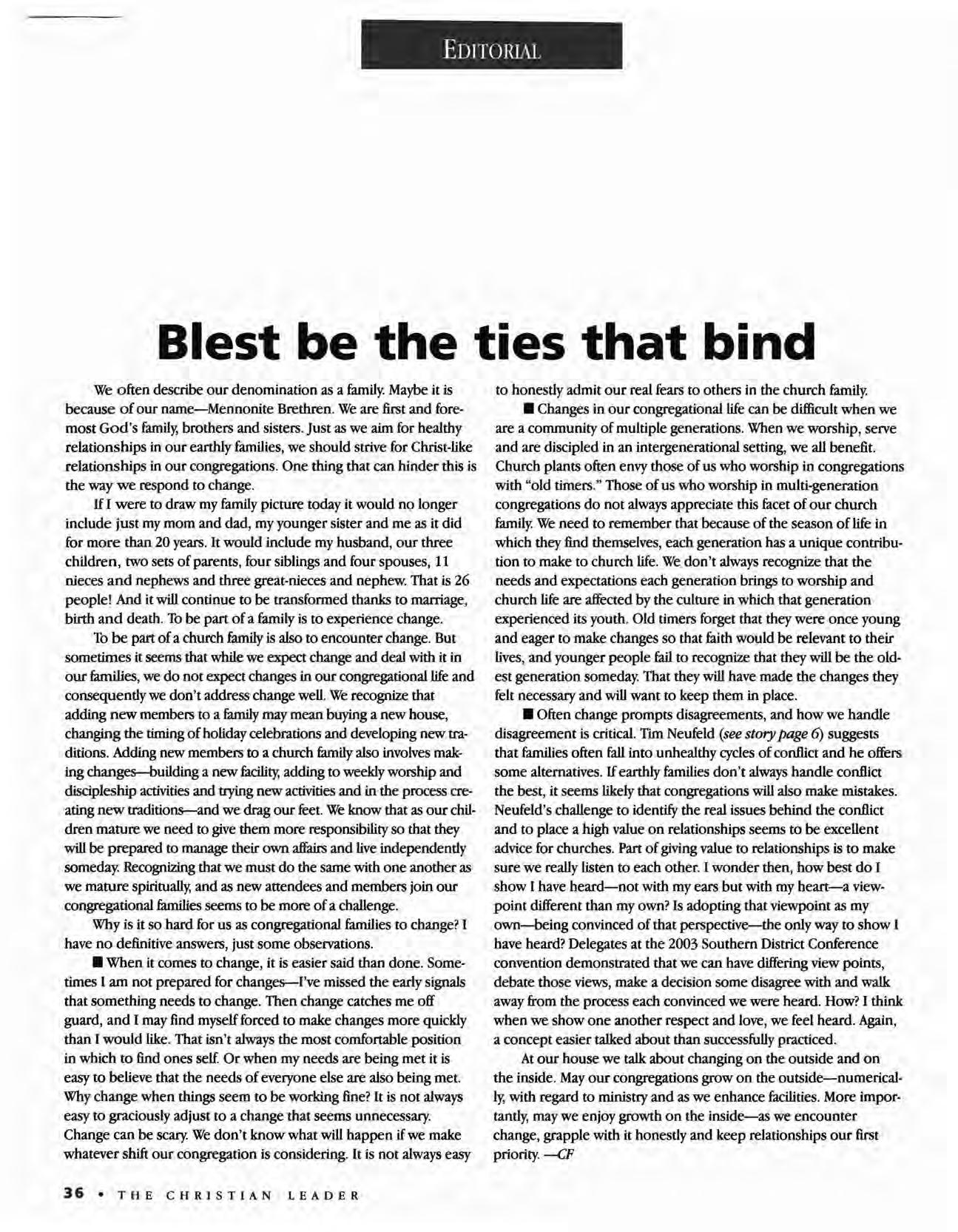• Often change prompts disagreements, and how we handle disagreement is critical. Tim Neufeld (see story page 6) suggests that families often fall into unhealthy cycles of conflict and he offers some alternatives. If earthly families don't always handle conflict the best, it seems likely that congregations will also make mistakes. Neufeld's challenge to identify the real issues behind the conflict and to place a high value on relationships seems to be excellent advice for churches. Part of giving value to relationships is to make sure we really listen to each other. I wonder then, how best do I show I have heard-not with my ears but with my heart-a viewpoint different than my own? Is adopting that viewpoint as my own-being convinced of that perspeetive-the only way to show I have heard? Delegates at the 2003 Southern District Conference convention demonstrated that we can have differing view points, debate those views, make a decision some disagree with and walk away from the process each convinced we were heard. How? I think when we show one another respect and love, we feel heard. Again, a concept easier talked about than successfully practiced.