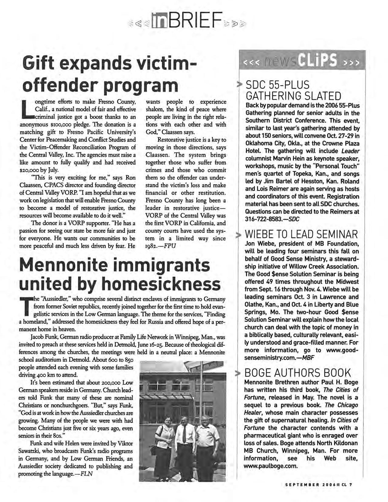 Back by popular demand is the 2006 55-Plus Gathering planned for senior adults in the Southern District Conference. This event, similar to last year's gathering attended by about 150 seniors, will convene Oct. 27-29 in Oklahoma City, Okla., at the Crowne Plaza Hotel. The gathering will include Leader columnist Marvin Hein as keynote speaker, workshops, music by the "Personal Touch" men's qL!artet of Topeka, Kan., and songs led by Jim Bartel of Hesston, Kan. Roland and Lois Reimer are again serving as hosts and coordinators of this event. Registration material has been sent to all SOC churches. Questions can be directed to the Reimers at 316-722-8583.-SDC