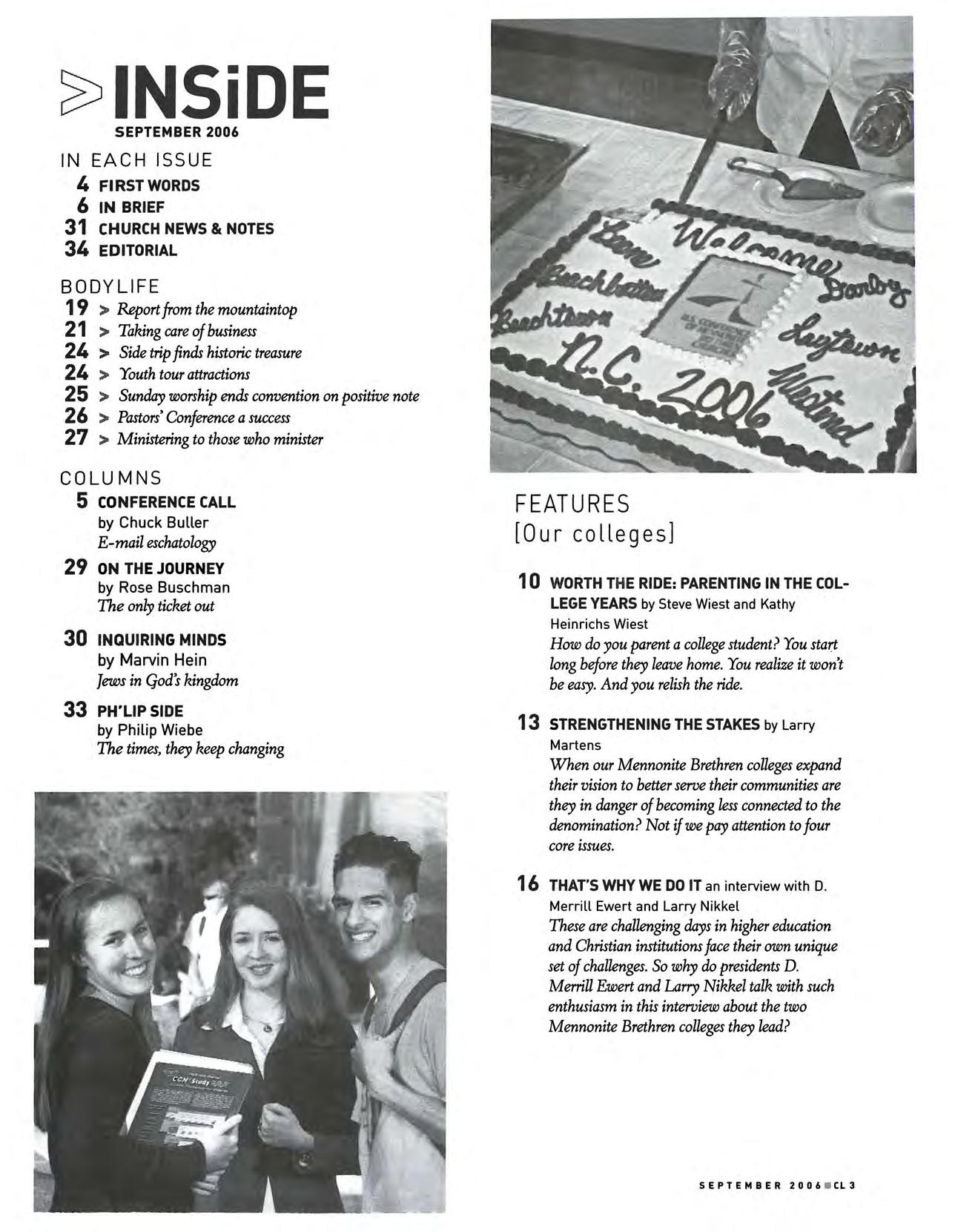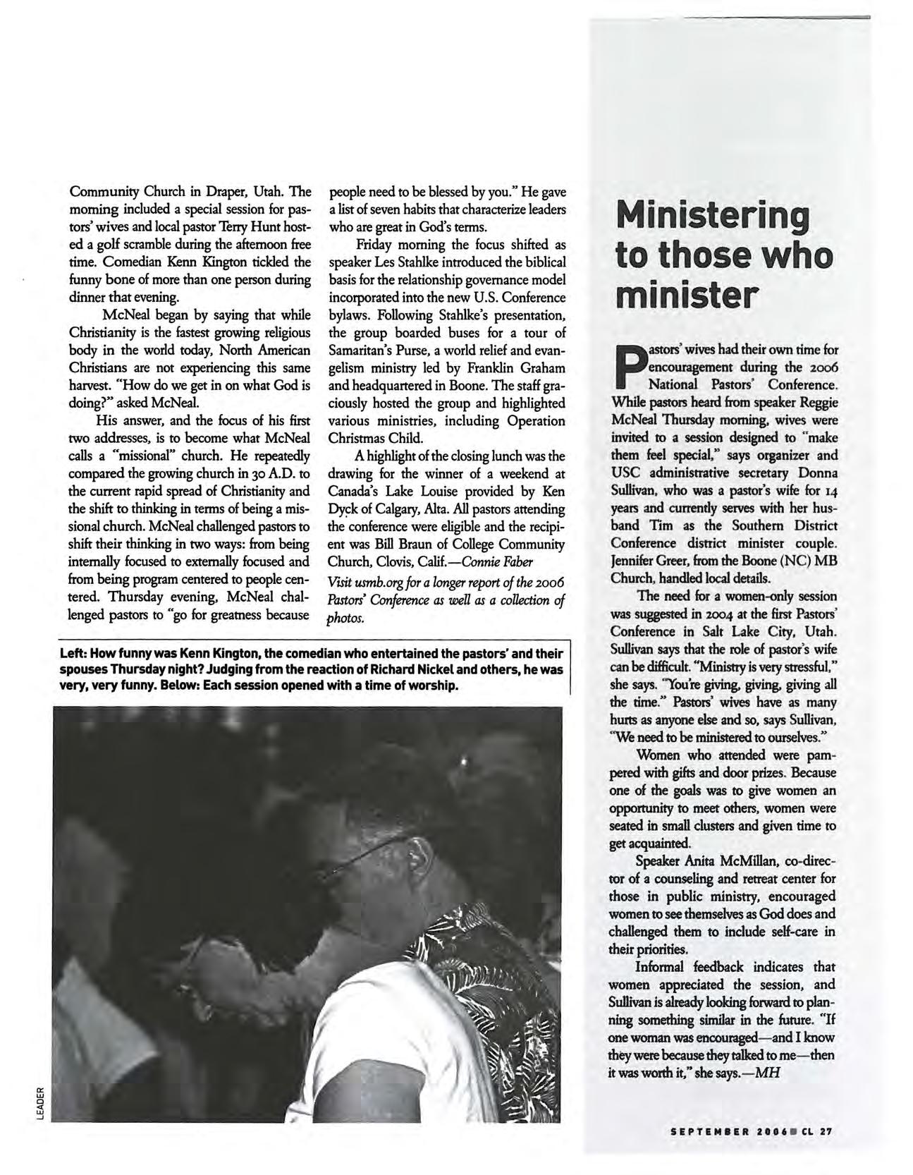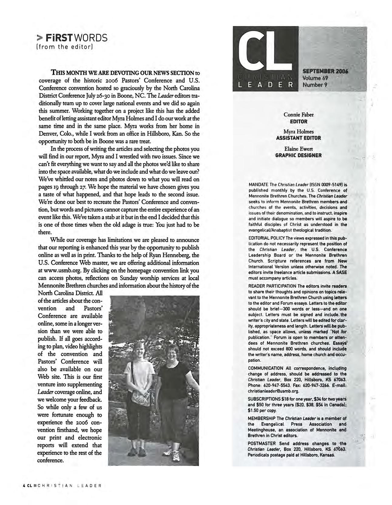 THIS MONTH WE ARE DEVOTING OUR NEWS SECTION to coverage of the historic 2006 Pastors' Conference and U.S. Conference convention hosted so graciously by the North Carolina District Conference July 26-30 in Boone, NC. The Leader editors traditionally team up to cover large national events and we did so again this summer. Working together on a project like this has the added benefit of letting assistant editor Myra Holmes and I do our work at the same time and in the same place. Myra works from her home in Denver, Colo., while I work from an office in Hillsboro, Kan. So the opportunity to both be in Boone was a rare treat.