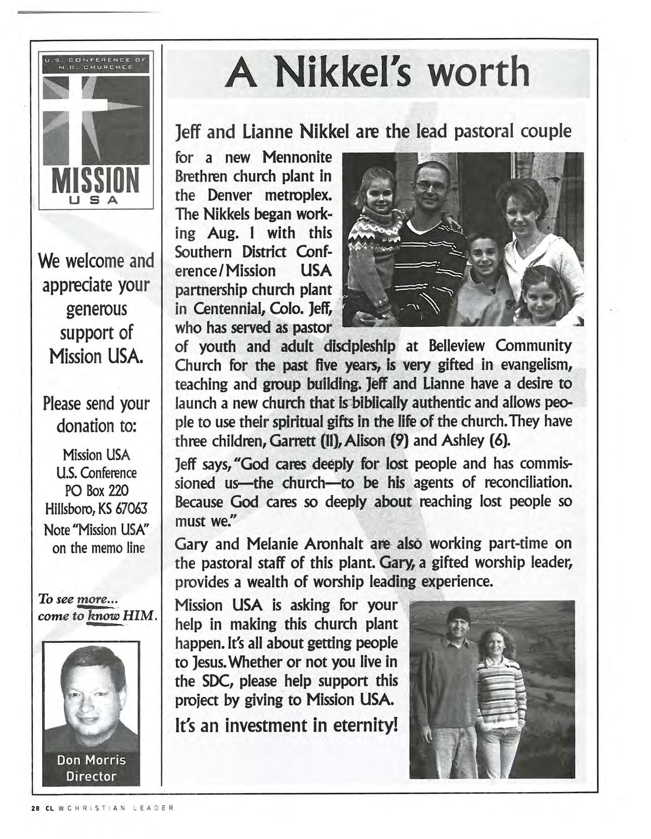 MANDATE The Christian Leader (l5SN 0009 -51491 is published monthly by the U S Conferen ce of Mennonite Brethren Churches The Christian Leader seeks to infor m Mennonite Brethren members and chu rc he s of th e events activities deci sions and iss ue s of thei r denomination and to instruct inspire and initiate dialogue so members will aspire to be fa ithful disciple s of Christ as understoOd in the evangelicaVAnabapti st theological tradition